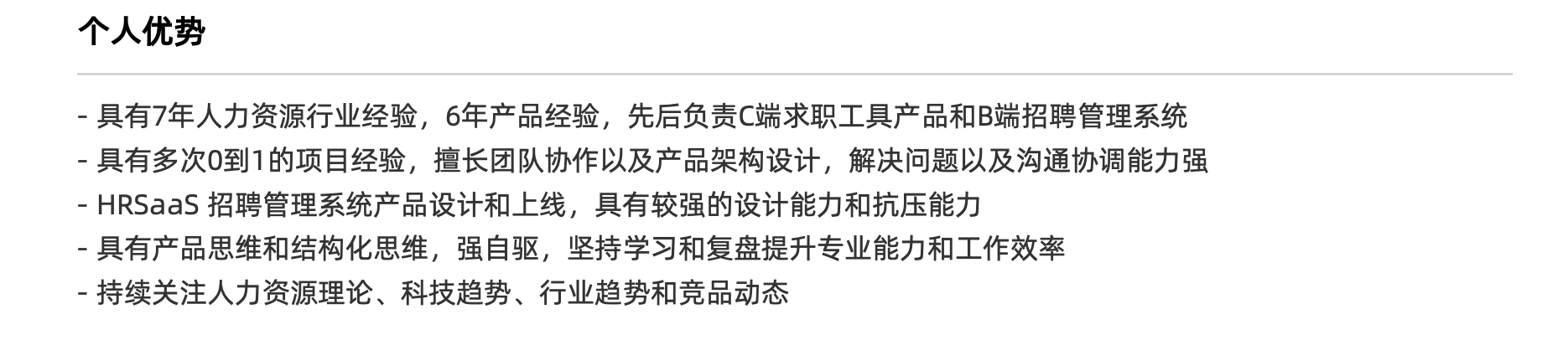 3、 【求职岗位】、【是否在职】建议写上,降低HR岗位匹配成本,例如“求职岗位:高级产品经理,在职状态:已离职/随时到岗”,【期望薪资】选择性写,如果你对于薪资要求是硬性,则建议写上,一般的做法是小厂可以写,如果匹配不上则不会邀约面试,减少时间成本,大厂可以不写,具体面试过了再谈。