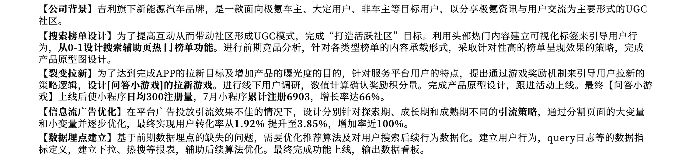 2、公司/项目角度撰写:“曾任职于阿里/腾讯/字节公司,担任高级产品经理职位,负责多个项目操盘经验(大厂同学专用文案)”、“负责千万用户量产品从零到一全生命周期搭建,年收入过亿(吹得有亿点大,根据自身调整)”、“与华为/阿里/腾讯合作共同完成XX项目并上线使用,在XX领域用户排行第一”