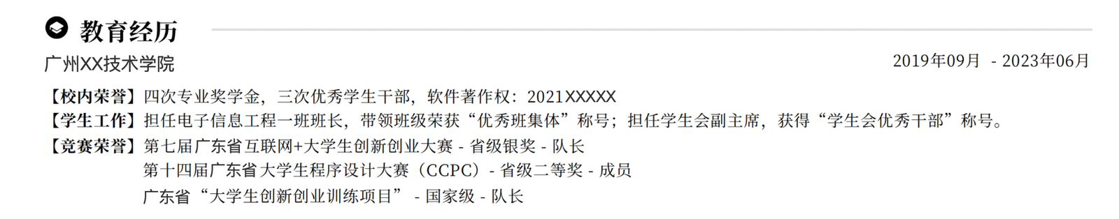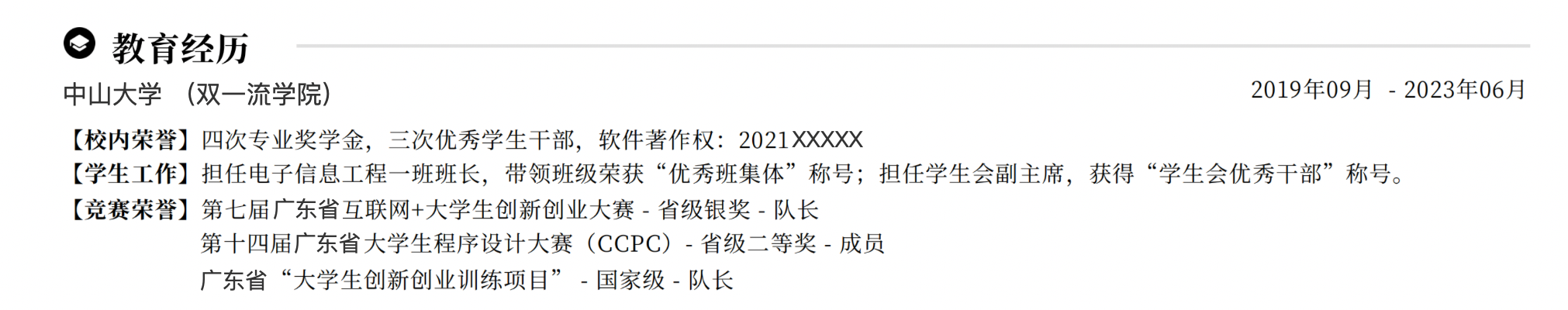 其次,教育背景的重要性会随着工作年龄的增加而逐渐减弱,三年以上工作经验的同学可以把学校荣誉部分省略,学历一笔带过,简要说明本或研即可。(专科的同学依旧是只写学校名)