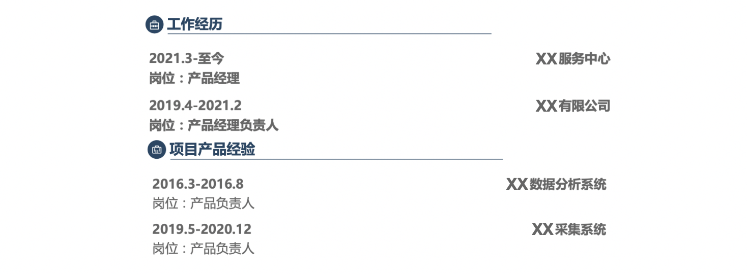 请注意,这部分内容要把工作内容梳理清晰并概括,例如“产品规划:独立负责XX产品0到1全流程功能规划”,而并非大杂烩般“负责XX产品规划、需求分析与产品设计,最终根据数据进行产品迭代”,体现出面试者的总结能力与工作逻辑能力。