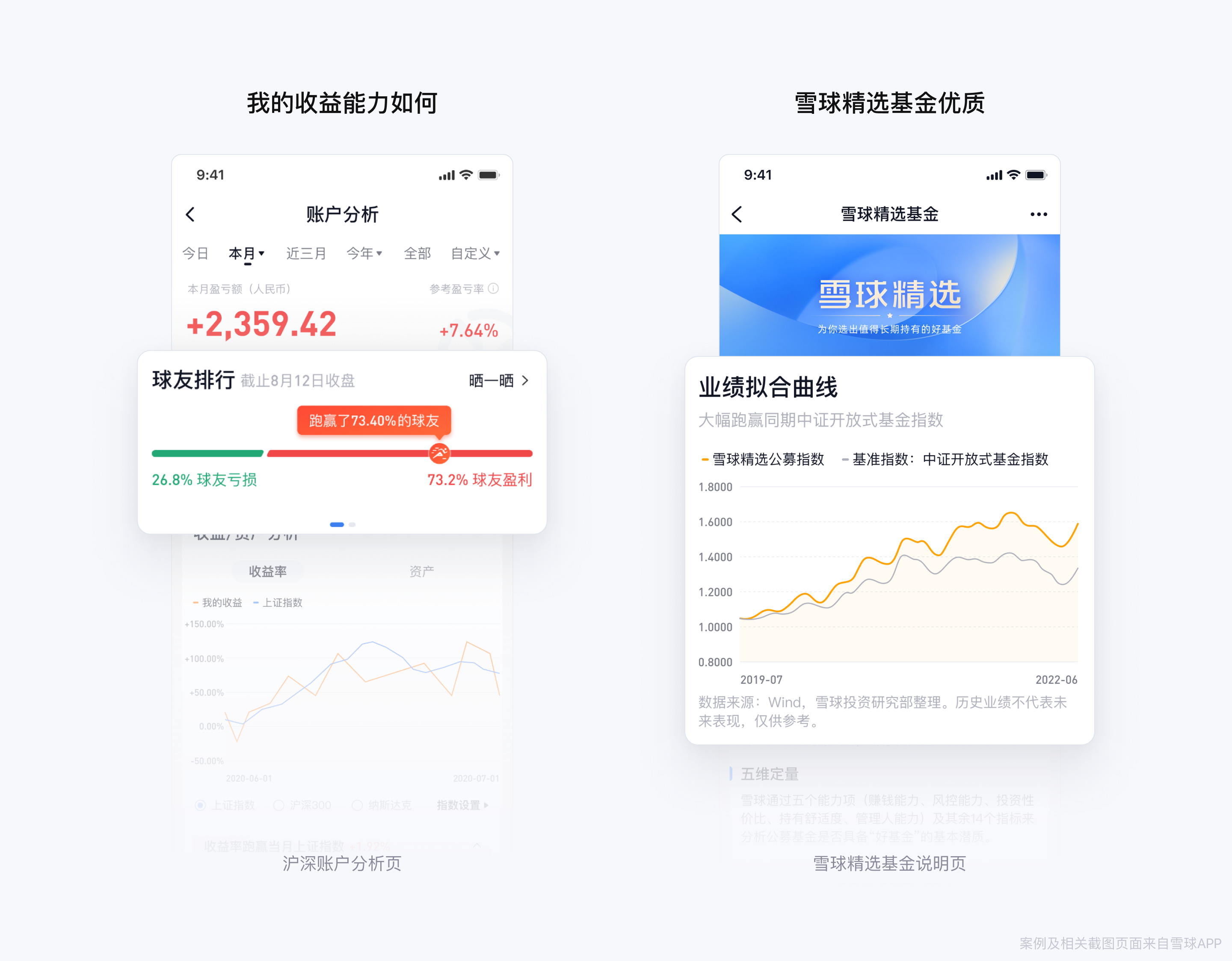 通过拟合精选基金和基准指数的业绩曲线,直观表现了雪球精选的基金产品在统计时段内的市场表现优于基准指数,让用户感知到雪球精选基金产品的优质特性。