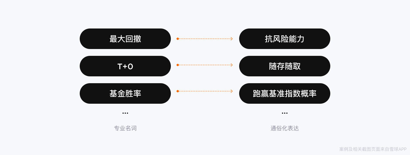 示例:在雪球基金详情页,“最大回撤”“T+0”“基金胜率”等专业名词可以用“抗风险能力”“随存随取”“跑赢基准指数概率”这种用户更容易理解的语言描述。