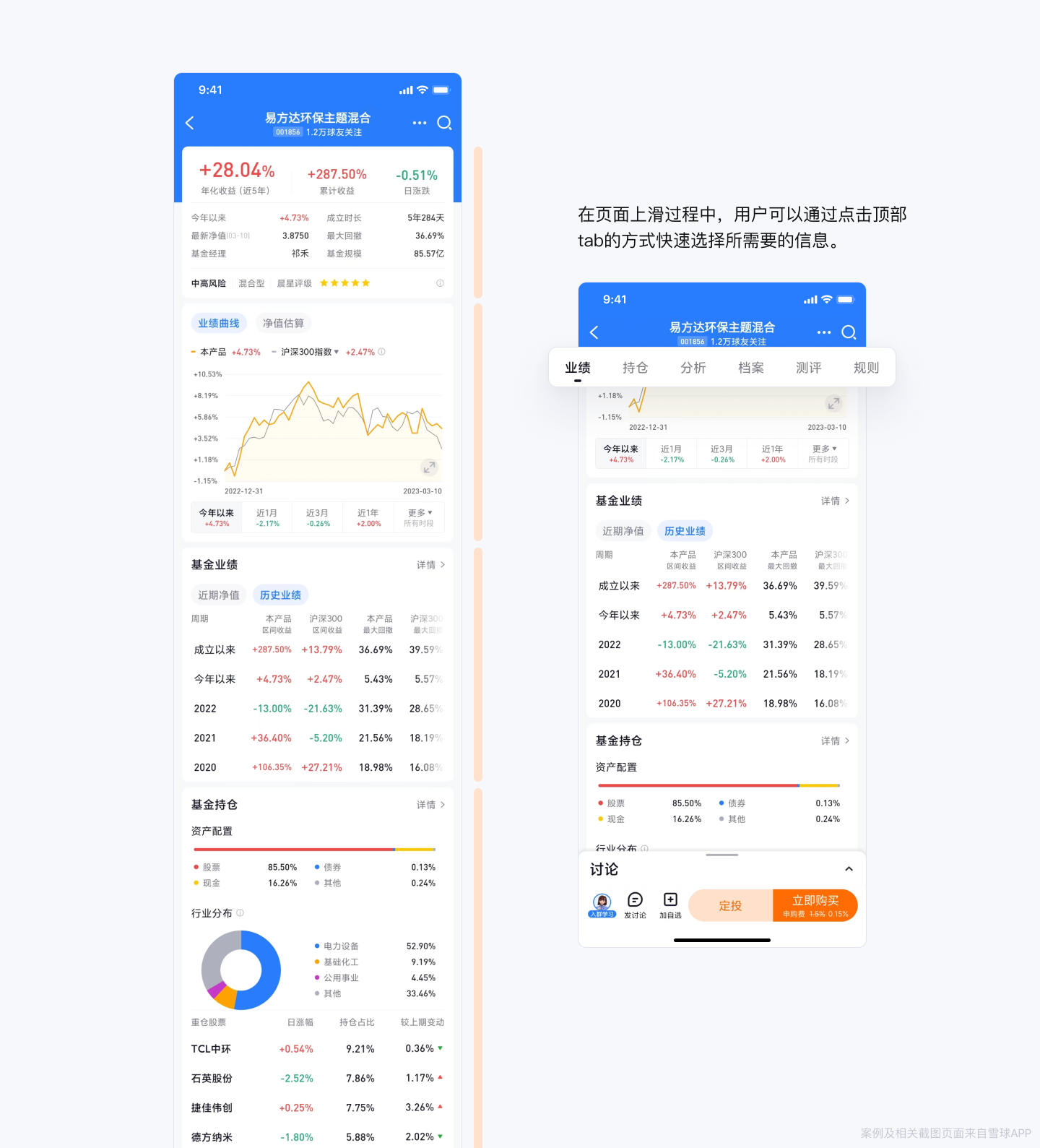 示例:在雪球公募基金的详情页中,我们梳理了基金行情数据及其他信息,并整理为“业绩”“持仓”“分析”“档案”“测评”“规则”六大模块。采用卡片作为信息收纳容器,使每个模块的信息更加聚焦。此外,在页面上滑过程中,用户还可以通过点击顶部tab的方式快速选择所需要的信息。