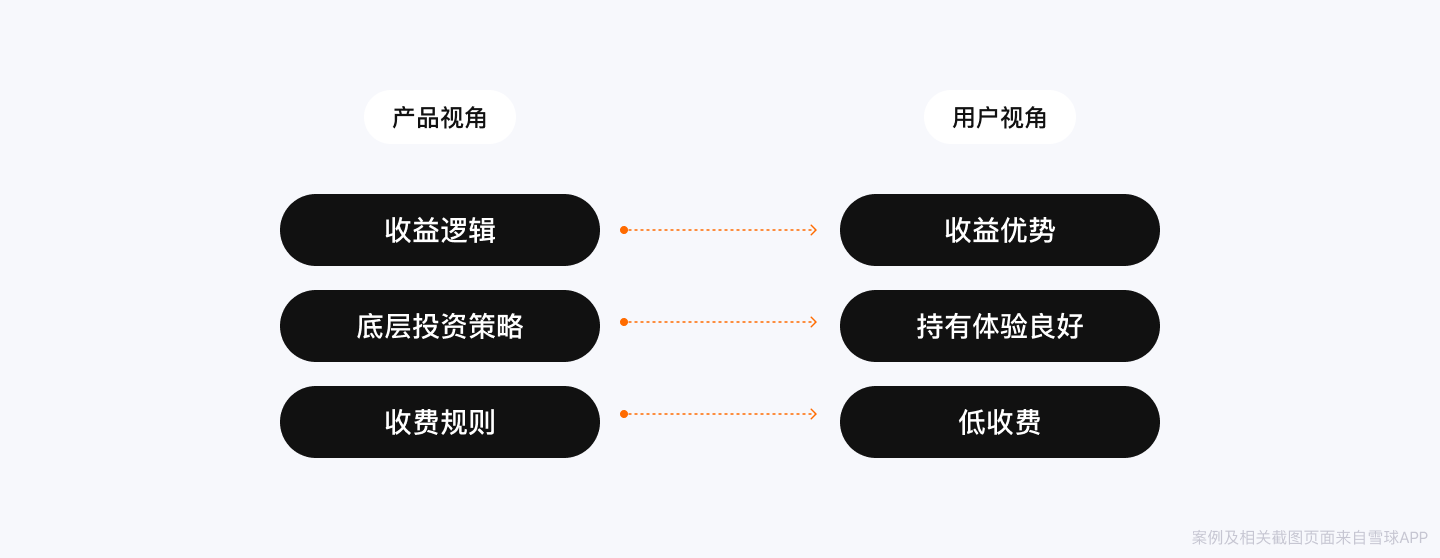 项目初期,产品信息内容是从产品视角出发进行描述的,其收益逻辑、底层投资策略以及收费规则比较复杂。为了让用户更容易理解,我们通过视角转换的降噪方式,把产品视角的信息描述提炼为用户视角的语言。我们希望通过突出产品的收益优势、持有体验良好以及低收费这三大核心利益点吸引用户,让用户产生兴趣。
