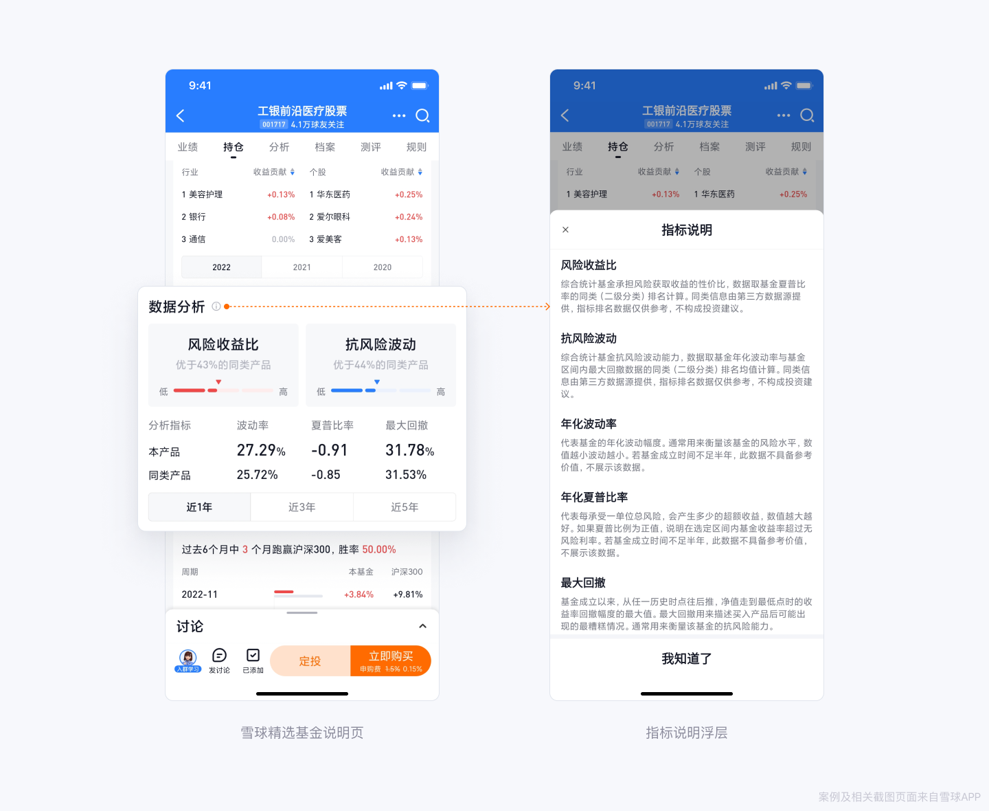 示例:在雪球基金详情页,对“数据分析”模块内的多个专业名词以浮层的形式进行进一步的解释说明。