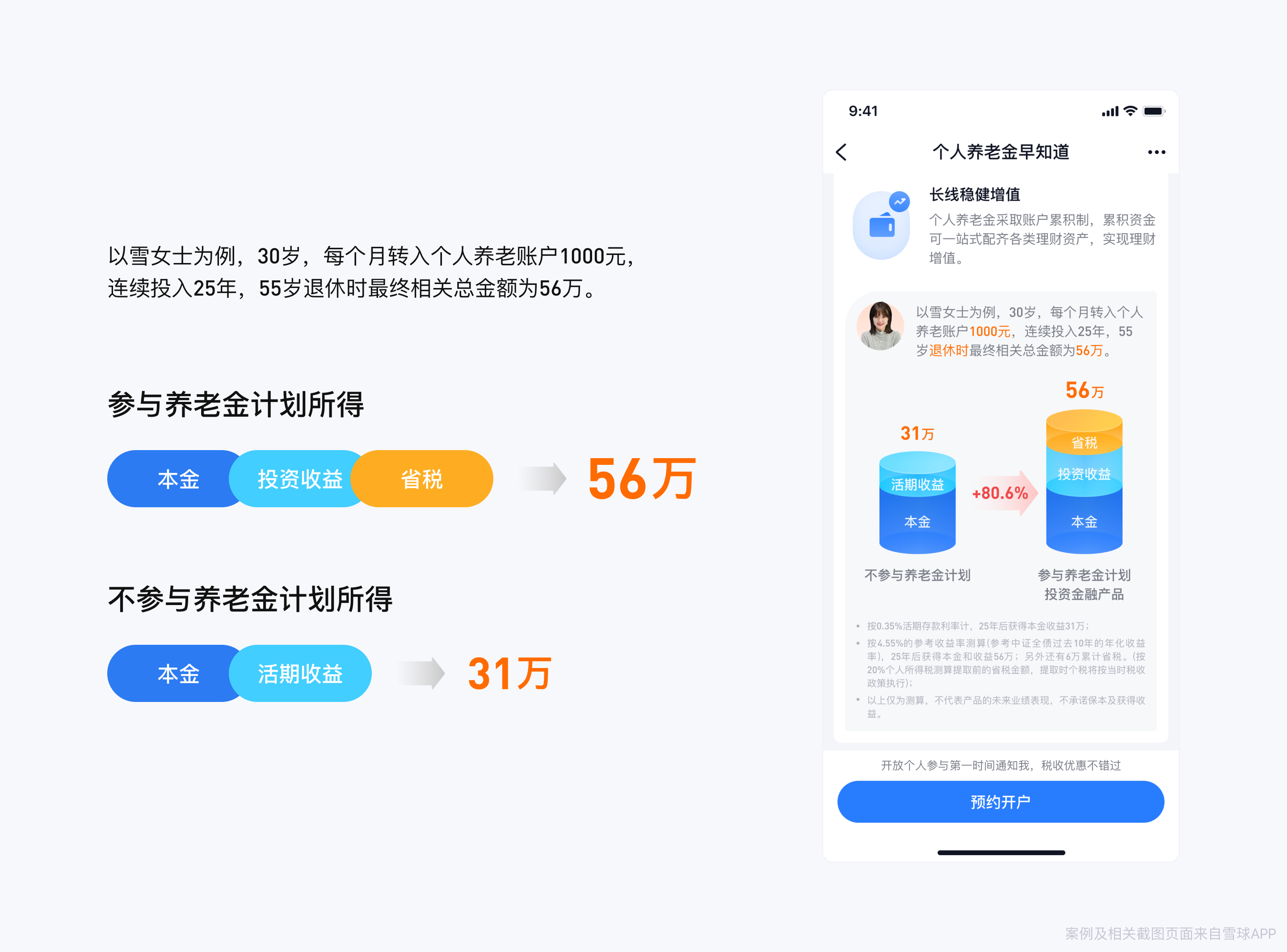 示例:在雪球的养老税延业务项目中,我们通过场景塑造的方式,以雪女士的投资为例,通过比较参与及不参与养老金计划的收益组成及最终所得,直观形象地体现了参与个人养老金计划的「个人所得税优惠」和「长线稳健增值」这两大利益点。
