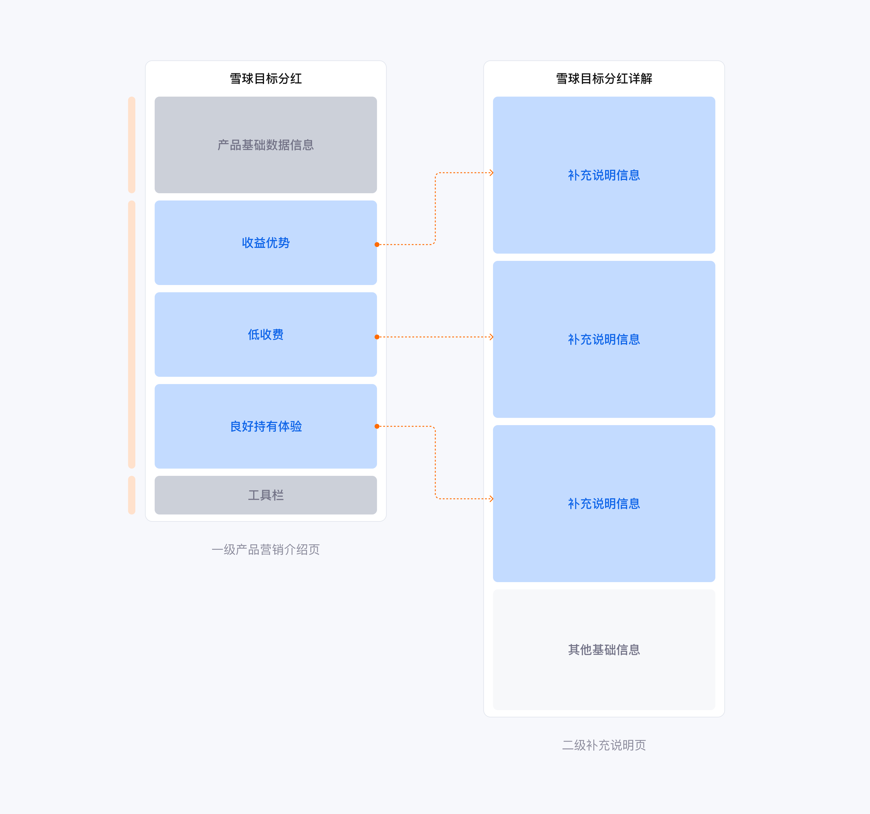 在用户首先触达的一级产品营销页,我们采用简单清晰的页面框架,从结构上分为三个模块:产品基础数据、用户关心的核心利益点以及底部行动操作栏。为了满足合规及信息披露的完整性,我们将更详尽的利益点补充信息及其他基础信息收纳在二级说明页,以满足部分学习型投资者获取更多信息的需求。这样,在用户首次访问产品营销页时,他们可以迅速了解产品的主要特点和关键利益点,并有机会深入了解更多信息。