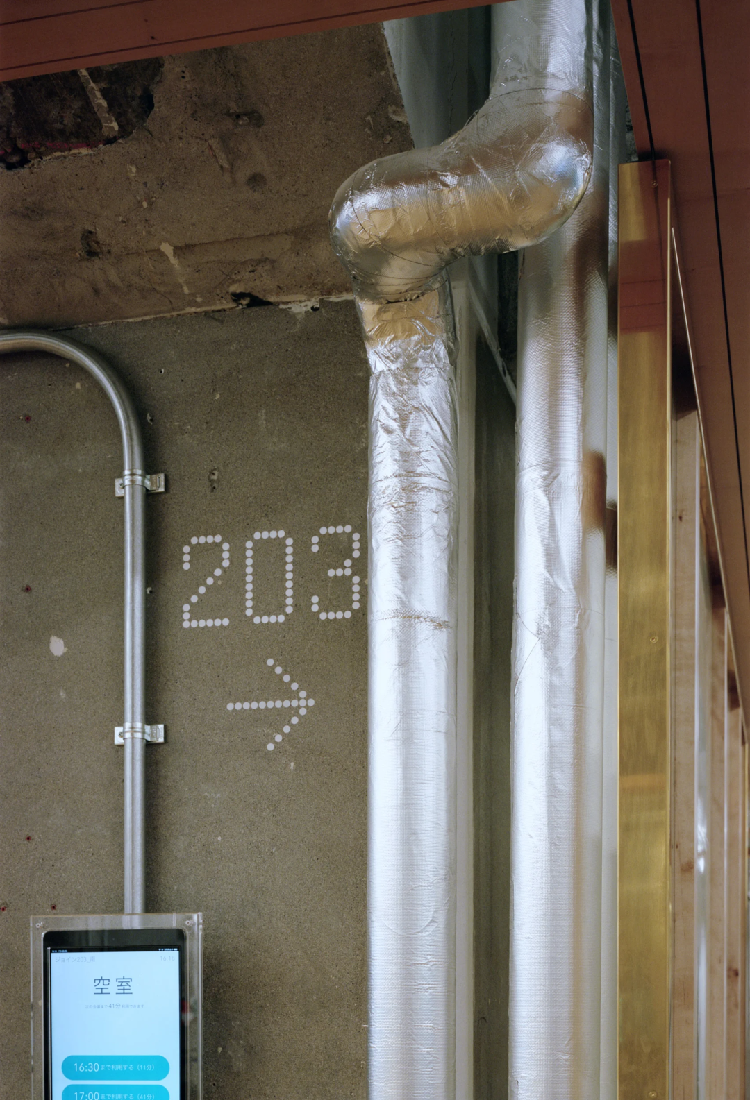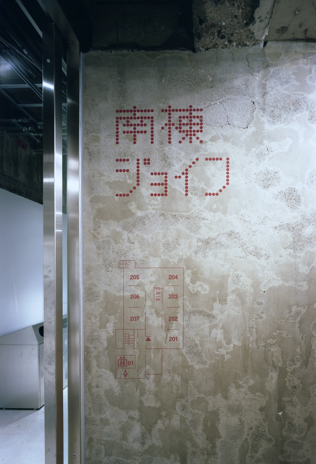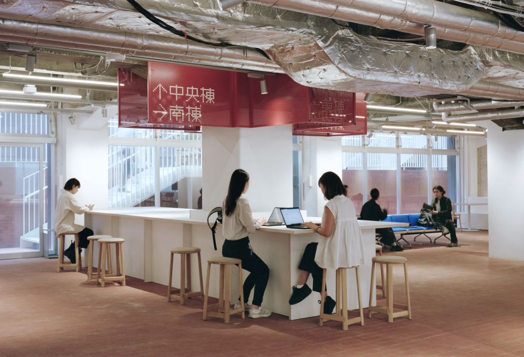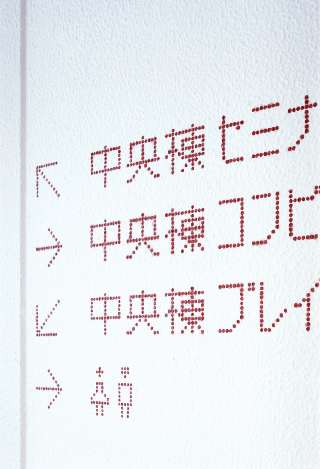 COVID-19热潮改变了人们的工作方式,Recruit提出了一种新的工作方式——“中台办公室”(一种立足于市中心和郊区之间的城市的方式),建筑师团队要求旧建筑结构中刻意裸露的柱子,希望用标志来软化这一点。长岛里佳子考虑版式设计、可读性和网孔透明度之间的平衡,设计了网状金属面板来遮盖柱子。采用红色和白色的配色方案,与空间形成统一的视觉效果。由网状材料制成的点状字母具有可读性和可更替性,并与建筑保持亲和力。