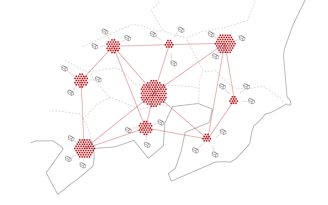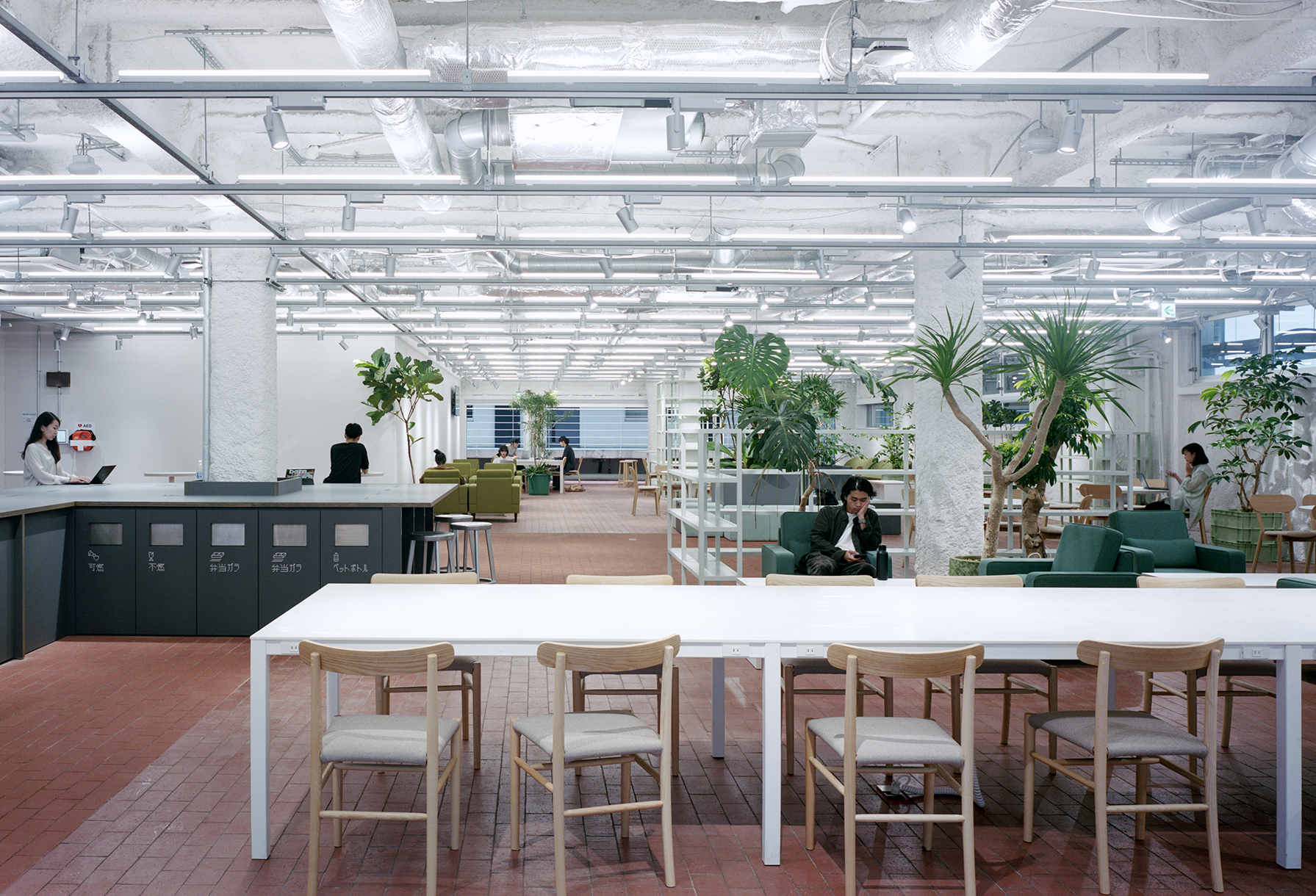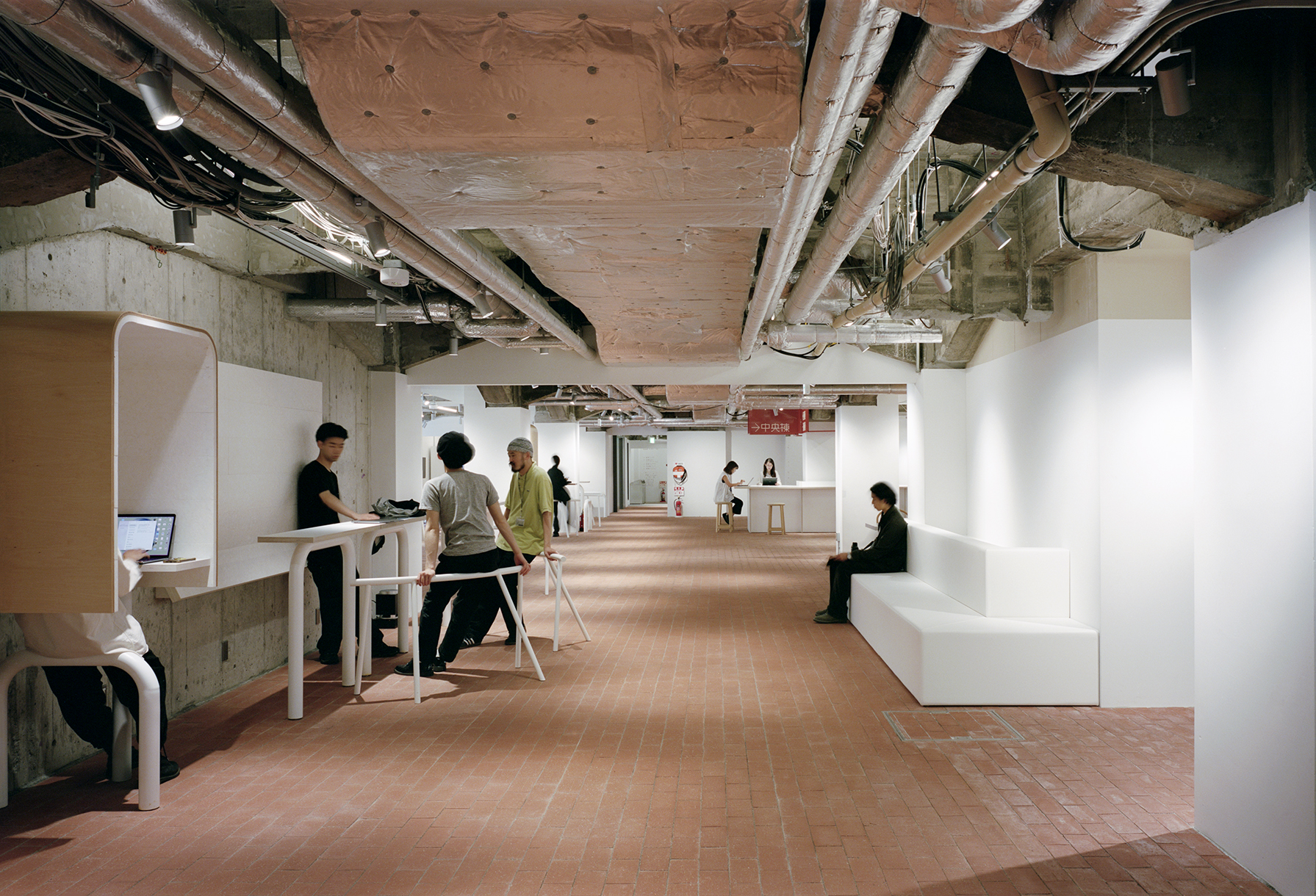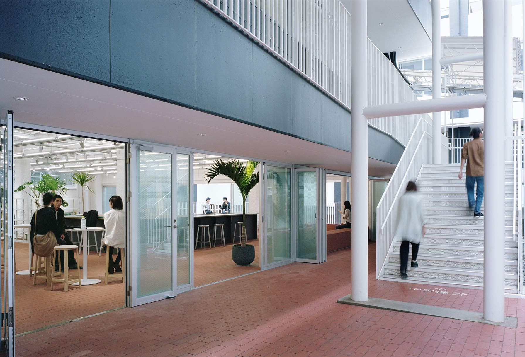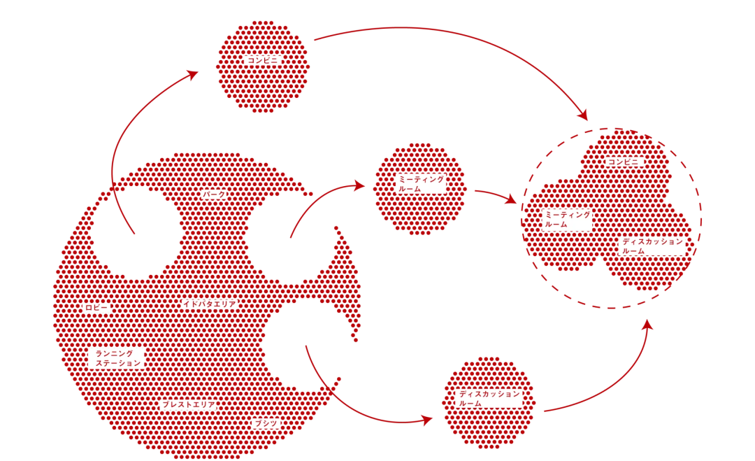COVID-19热潮改变了人们的工作方式,Recruit提出了一种新的工作方式——“中台办公室”(一种立足于市中心和郊区之间的城市的方式),建筑师团队要求旧建筑结构中刻意裸露的柱子,希望用标志来软化这一点。长岛里佳子考虑版式设计、可读性和网孔透明度之间的平衡,设计了网状金属面板来遮盖柱子。采用红色和白色的配色方案,与空间形成统一的视觉效果。由网状材料制成的点状字母具有可读性和可更替性,并与建筑保持亲和力。