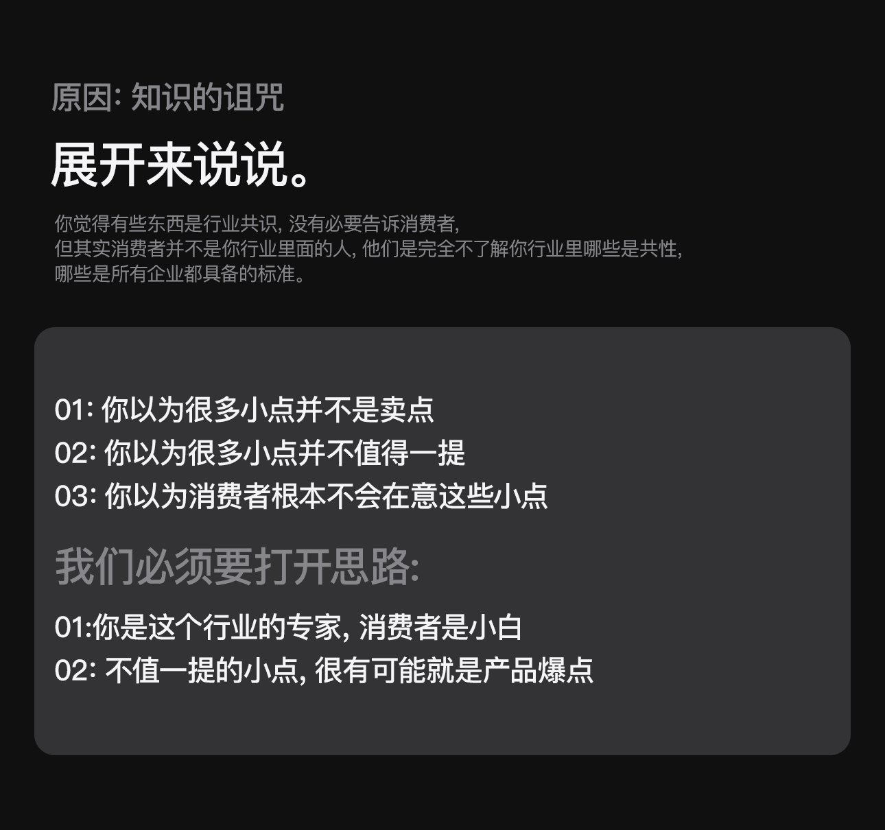 01:对产品的拆解不到位,在写产品卖点的时候信息是不足的, 最后你在写文案的时候就会非常难,效率非常低;
