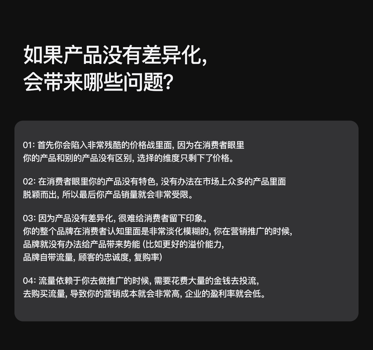 同质化在消费者眼里会觉得你的产品没有核心卖点,你的产品和其他产品都一样,消费者在购买的时候能够选择的维度就只剩下了价格;所以你会陷入到价格战里面,导致企业利润非常低。