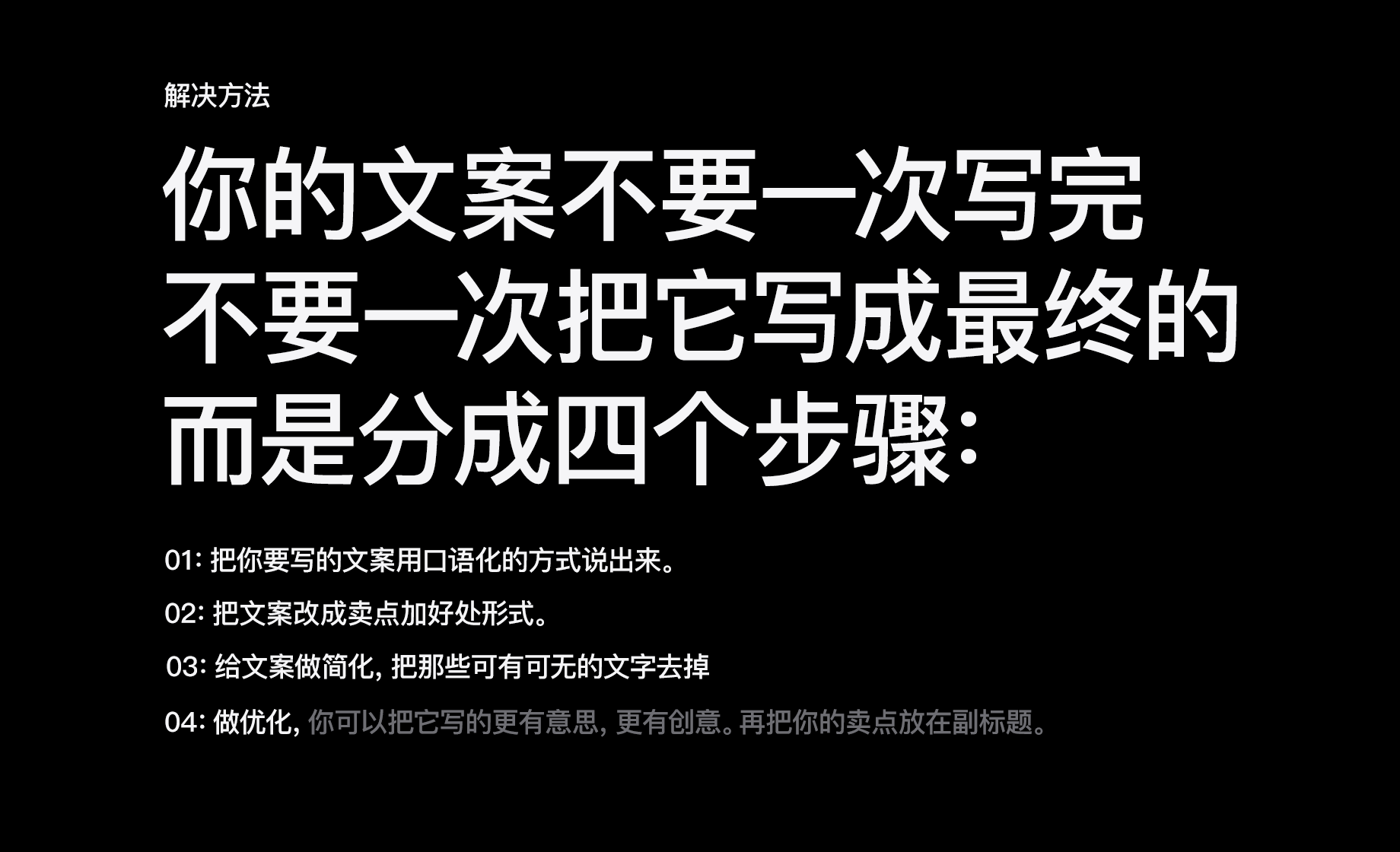 03:先把文案写烂。前期不考虑文案到底好不好,因为这个时候你梳理的是产品卖点,在这个阶段文案差一点也没关系,到后面在做优化。
