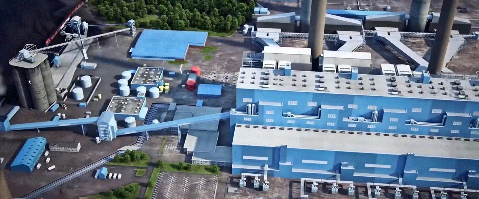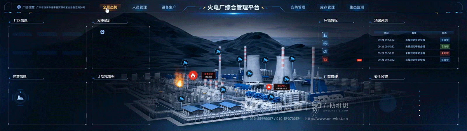以火电厂为例,利用3D仿真技术1:1还原火电厂全貌,使管理者整体感知火电厂情况。主视觉显示火电厂全貌,展示用电、供热和厂区负荷情况,并能立刻发现火灾、非法闯入等重大险情,及时作出应急措施。左侧展示厂区运营信息、发电统计、经营信息、计划完成率卡片,便于管理者根据情况控制人流量,调整生产计划,实现降本增效。右侧卡片展示烟尘、汞排放、PM2.5等环境情况,便于把握污染物排放和生产控制情况,以及时进行生产控制和污染治理装置的控制。设置安全预警和预警列表,提示及时处理安全隐患。