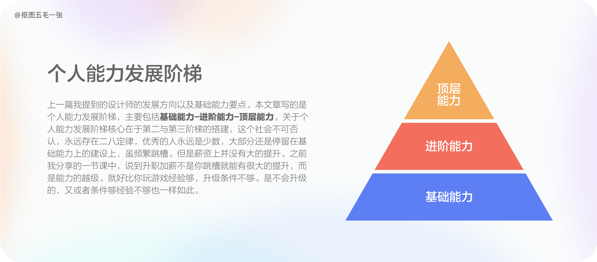 上一篇我提到的设计师的发展方向以及基础能力要点。本文章写的是个人能力发展阶梯,主要包括基础能力-进阶能力-顶层能力。关于个人能力发展阶梯核心在于第二与第三阶梯的搭建,这个社会不可否认,永远存在二八定律,优秀的人永远是少数,大部分还是停留在基础能力上的建设上,虽频繁跳槽。但是薪资上并没有大的提升。之前我分享的一节课中,说到升职加薪不是你跳槽就能有很大的提升,而是能力的越级。就好比你玩游戏经验够,升级条件不够。是不会升级的,又或者条件够经验不够也一样如此。