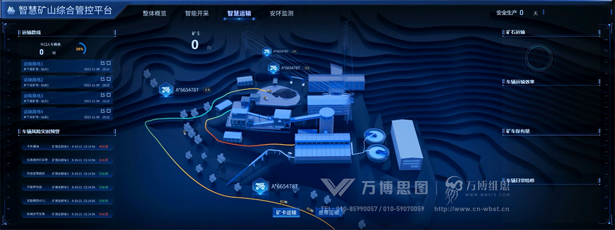 不同地区、不同类型的矿山在地质条件、资源禀赋、开发方式等方面千差万别,在智慧矿山建设方面并没有绝对的范式。为提高模板的普适性,万博思图根据矿山常见生产管理流程,设置智能开采、智慧运输、安环监测三大细分模块,供管理者精细化管理。