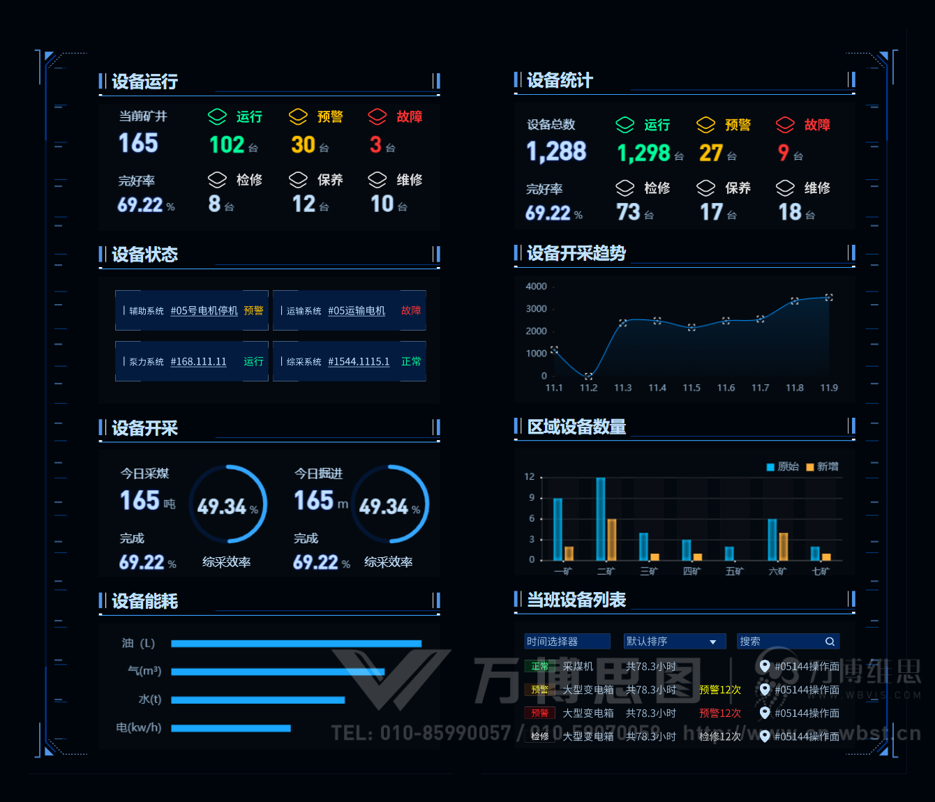 设备是矿山安全生产的保证,做好设备运行管理有利于矿山生产效益的提高。智慧矿山综合管控平台对生产设备和安环设备的维护情况、各区域设备数量、运行效率监测,并以图标、表格的形式进行实时预警,保证矿山开采、运输、监测设备正常运行。