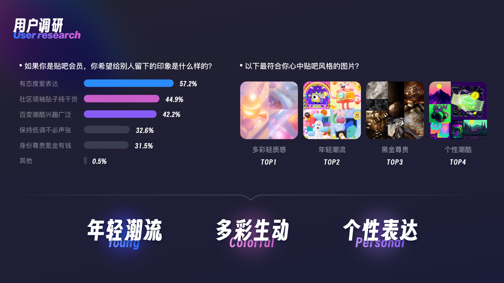 前期为了更了解用户对于贴吧会员满意程度和视觉偏好,我们做了一次问卷调查,选择了活跃度较高的3000多个用户进行调研。出乎我们意料的是,贴吧用户对会员的理解并不是传统的“尊贵感”、“精致感”,反而更多人希望彰显自己“有态度爱表达”、“社区意见领袖”、“百变潮酷青年”的性格特征。这也和吧友们有个性、有态度、爱整活的社区氛围不谋而合。