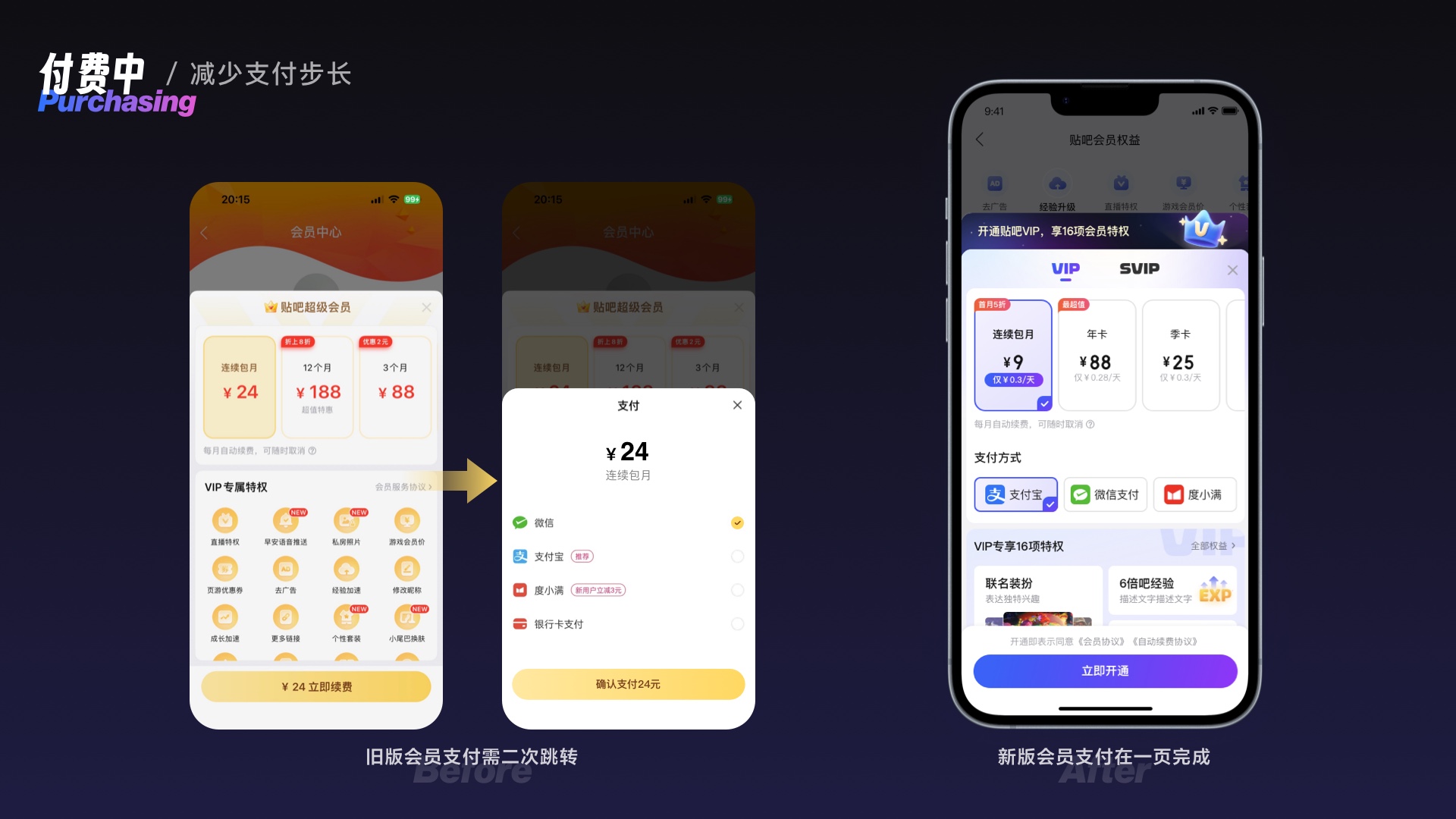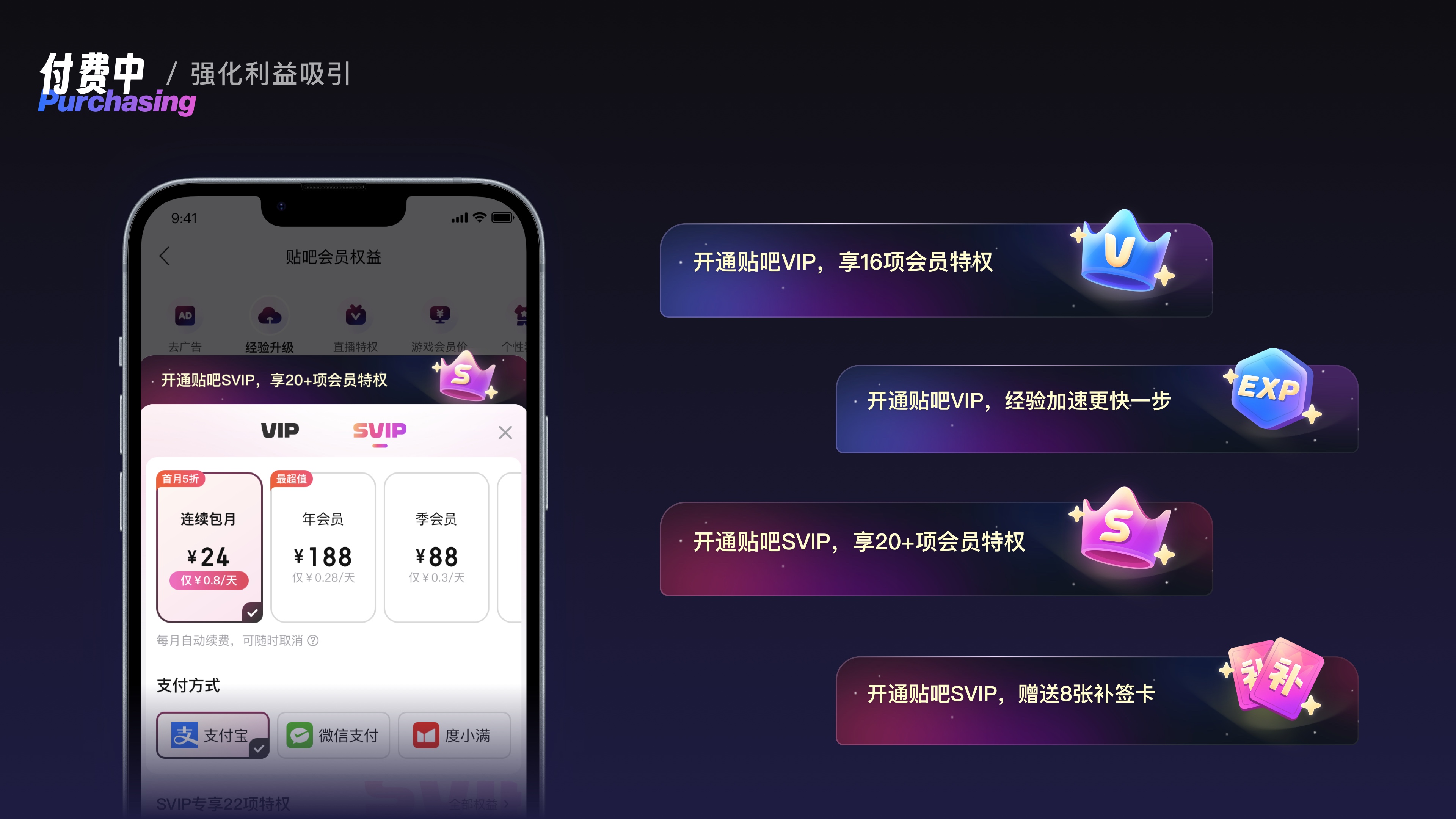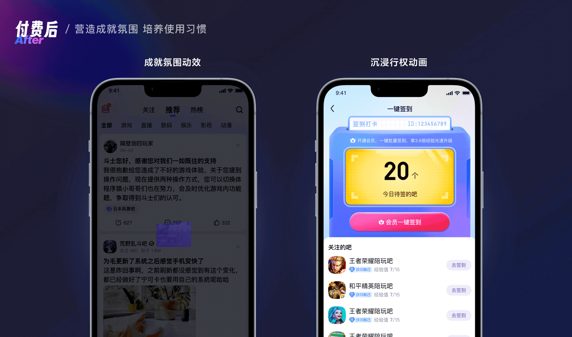 贴吧作为拥有20年历史的社区产品,一直追求创新和变化,在会员体系上也没有一味追求通常意义的尊贵感、精致感。从前期用户调研、风格尝试,明确了属于贴吧用户的年轻潮酷的视觉语言。通过不断尝试和打磨视觉风格,用户对权益感知有所提升,超过一半的用户表示页面焕然一新,有为颜值买单的冲动。同时与业务密切交流,优化付费前、中、后使用体验,会员收入和数据有显著提升。