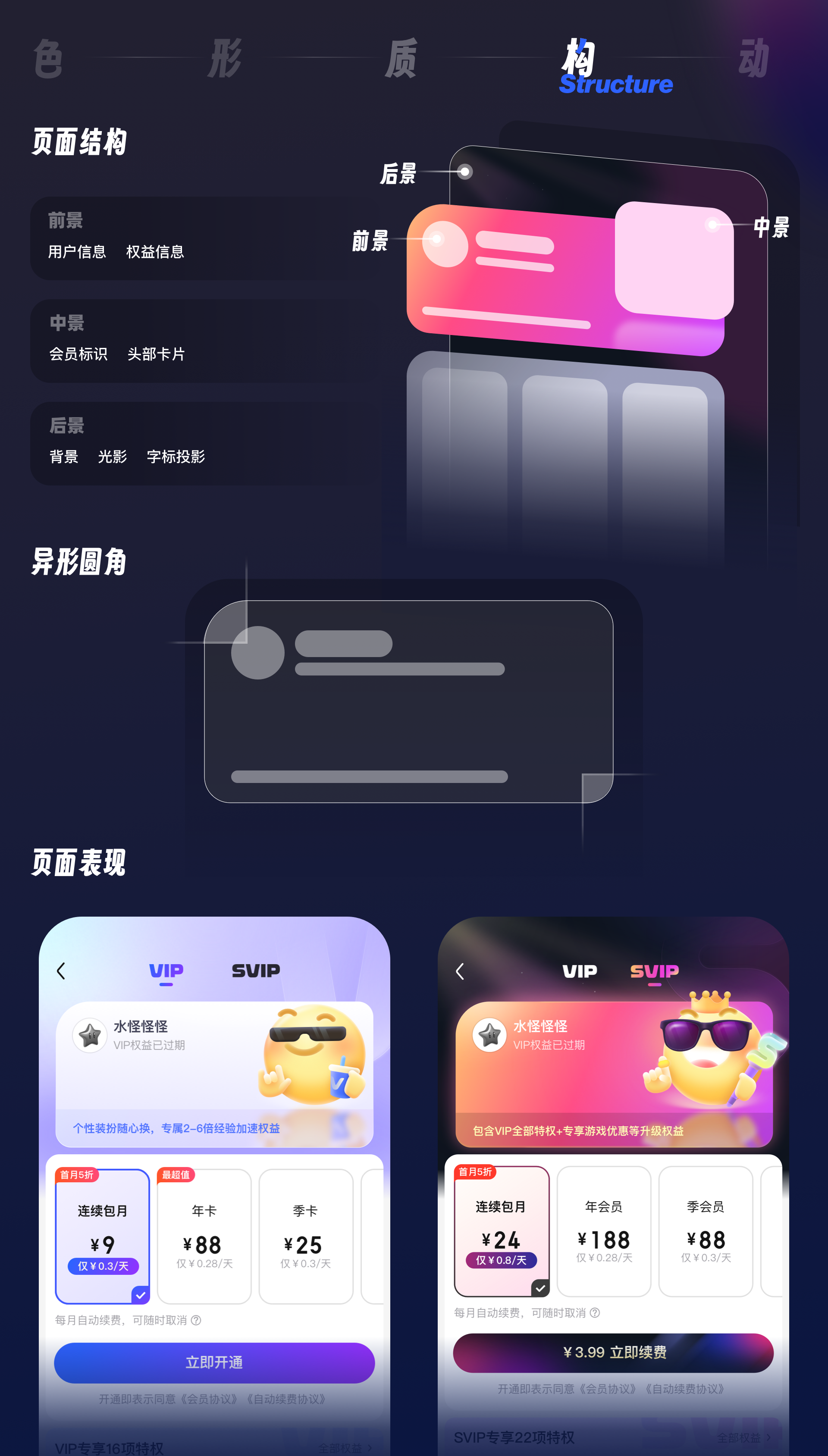 SVIP主基调以透光彩黑为主,头部卡面选用黄红紫的炫彩渐变,相互配合形成强烈对比,使整个头部看起来更加绚丽突出,给用户传达出高贵、炫酷视觉感受。