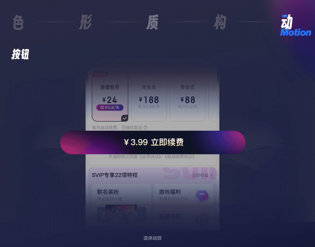 滑稽是以搞怪性格出圈,我们希望以动效的方式能够让人物性格变得更加饱满。预备动作与肢体联动强化了节奏感与夸张性,并对身份道具元素的出场添加了故事性,在续费按钮中也融入流体效果,在首屏与IP联动下强化了会员页整体带给用户的吸引力。