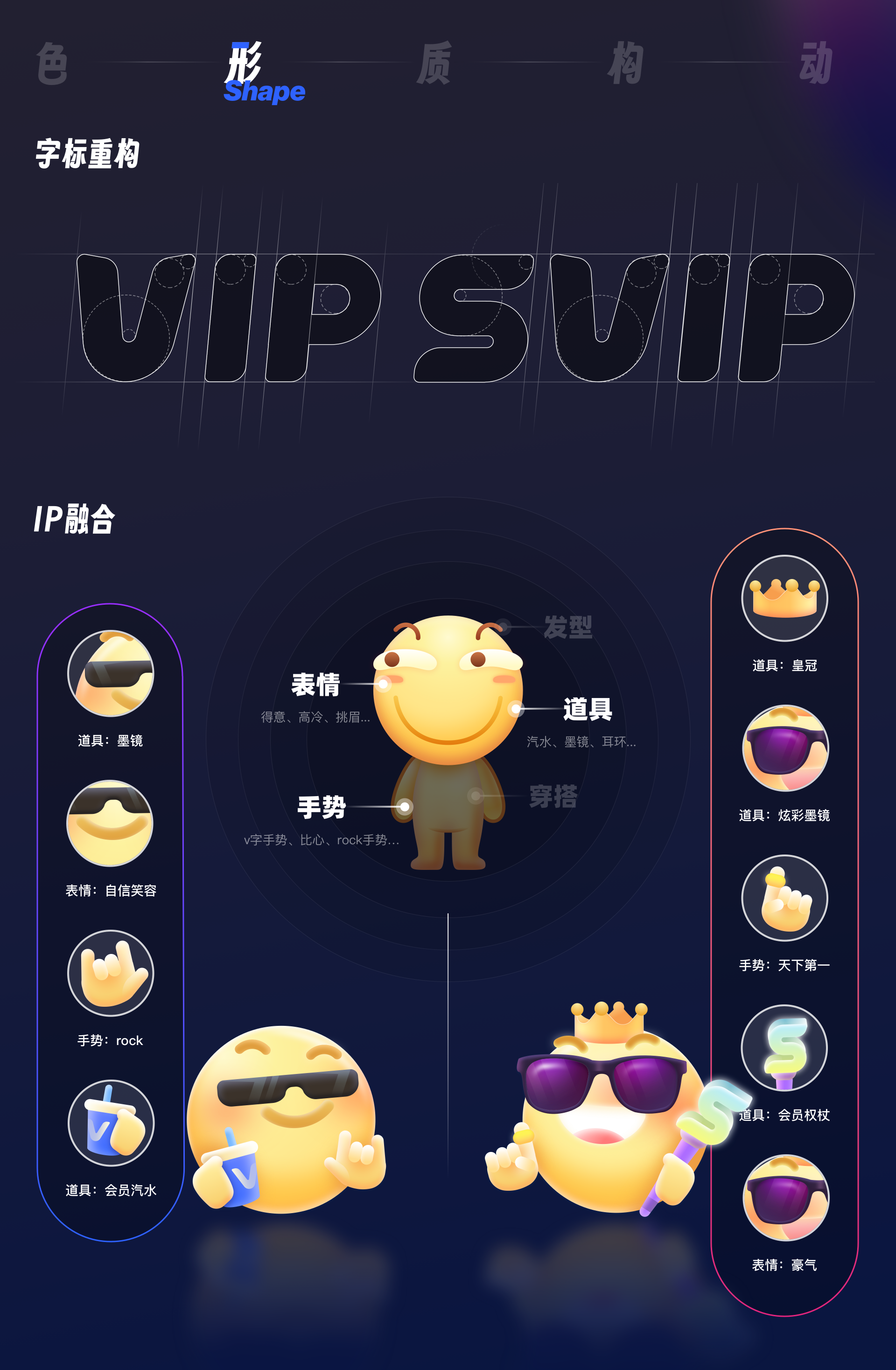 通过表情传递性格,道具传递身份,手势放大特性的方向分别对VIP和SVIP的形象进行打造。