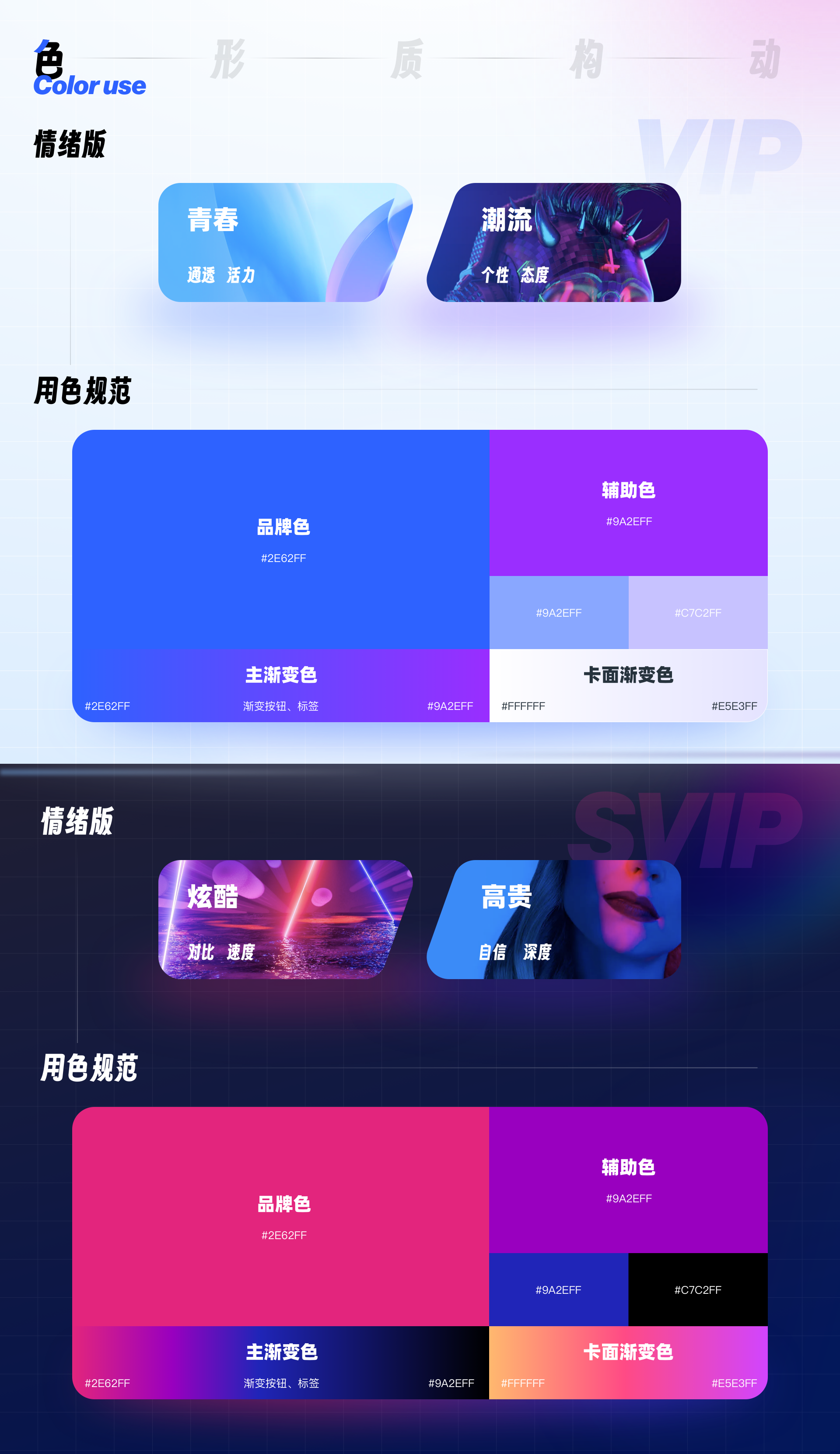 VIP选用高饱和高明度蓝为视觉主基调,融入紫色作为辅助使整体更加鲜亮具有通透性,通过降低饱和度的手段延展出的相近色配合,让整体页面传达出一种青春、潮流的视觉感受。