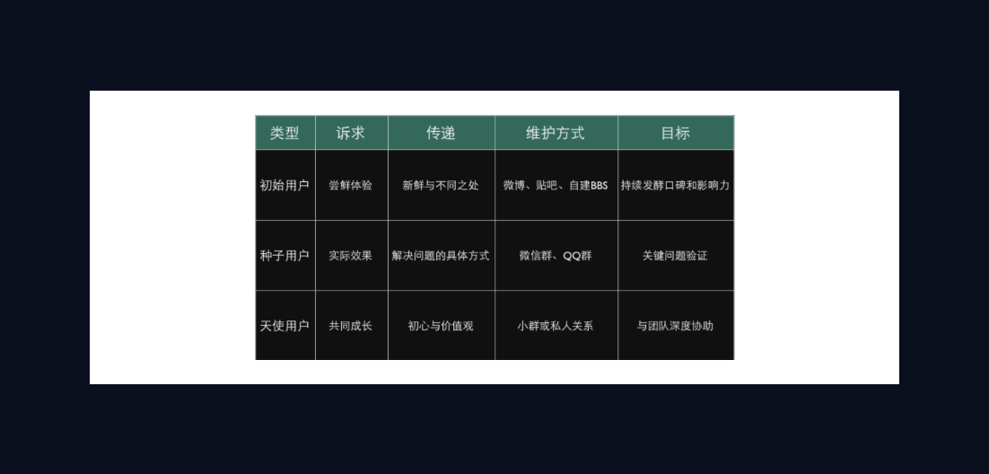 · 初始用户:最早愿意来的人。他们往往是具有很强好奇心特质的一群人,他们非常关注新鲜事物,也会乐意到处搜集,如果发现不错的东西还愿意告诉身边的朋友。他们会乐于尝试使用,但不一定会形成稳定的使用习惯,所以不一定是种子用户 · 种子用户:最早真正使用的人。这是你真正的目标用户,因为你的产品或服务恰恰解决了他们的燃眉之急,或让他们暂时无法找到更好的替代品。所以他们会愿意在你这里多花些时间,哪怕有些小难受也会暂时包容。不过种子用户一旦发现更加符合他们需求的替代品,大多数还是会马上转换阵地。