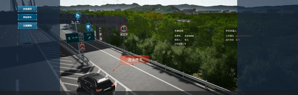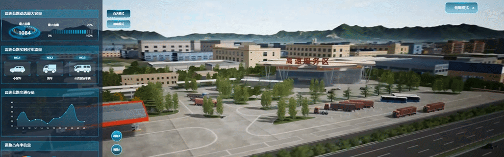 通过采集设备采集的实时数据,对高速路段、收费站、服务区、植物、配楼、车辆等建模还原,构建场景底座。宏观展示环境、设施、事件等高速概况信息,以俯视角度纵观整个高速拥堵、封路、事故、维护等路况。