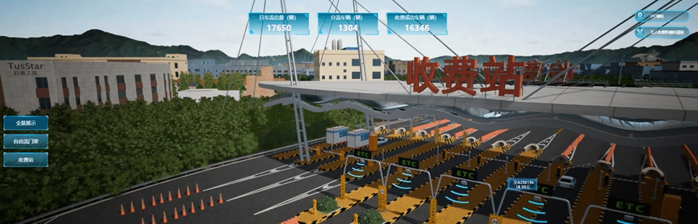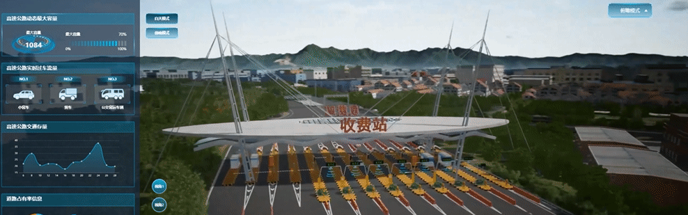 对收费站进行1:1还原建模,对无人收费的收费状况进行模拟展示,通过设备数据对车辆经过的门架设备进行监测,根据车辆信息预测无人收费站的通行状况,对车辆超载情况进行预警提示。