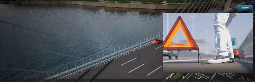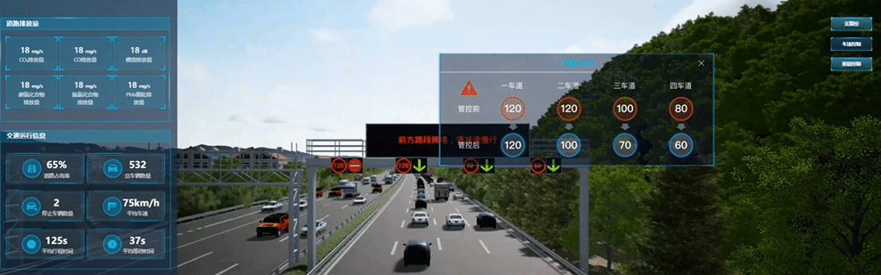 综合展示与现实一致的天气、季节的整体情况,模拟风雪雨雾、路面积水、结冰等状况。展示高速公路交通仿真的应用场景,包含无管控状态、车速控制、匝道控制、桥梁压力、匝道分流等,帮助运维管理人员综合分析和研判。