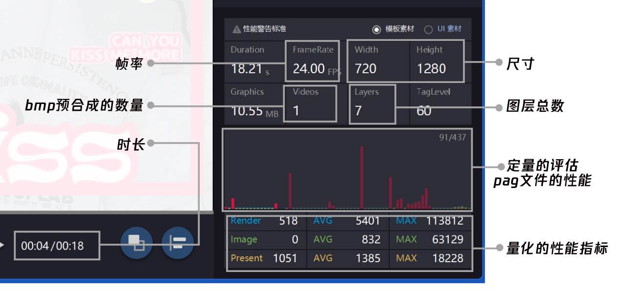 针对此问题,PAG在桌面预览工具 PAGViewer 上增加了性能检测的功能,可以让设计师很方便地看到PAG动画的基本信息,还有量化的性能指标,定量地评估 PAG 文件的性能,以可视化的方式感知素材性能状态,方便设计师进行针对性的优化,而不需要依赖研发上线测试性能状态,极大减少了素材优化的返工耗时。