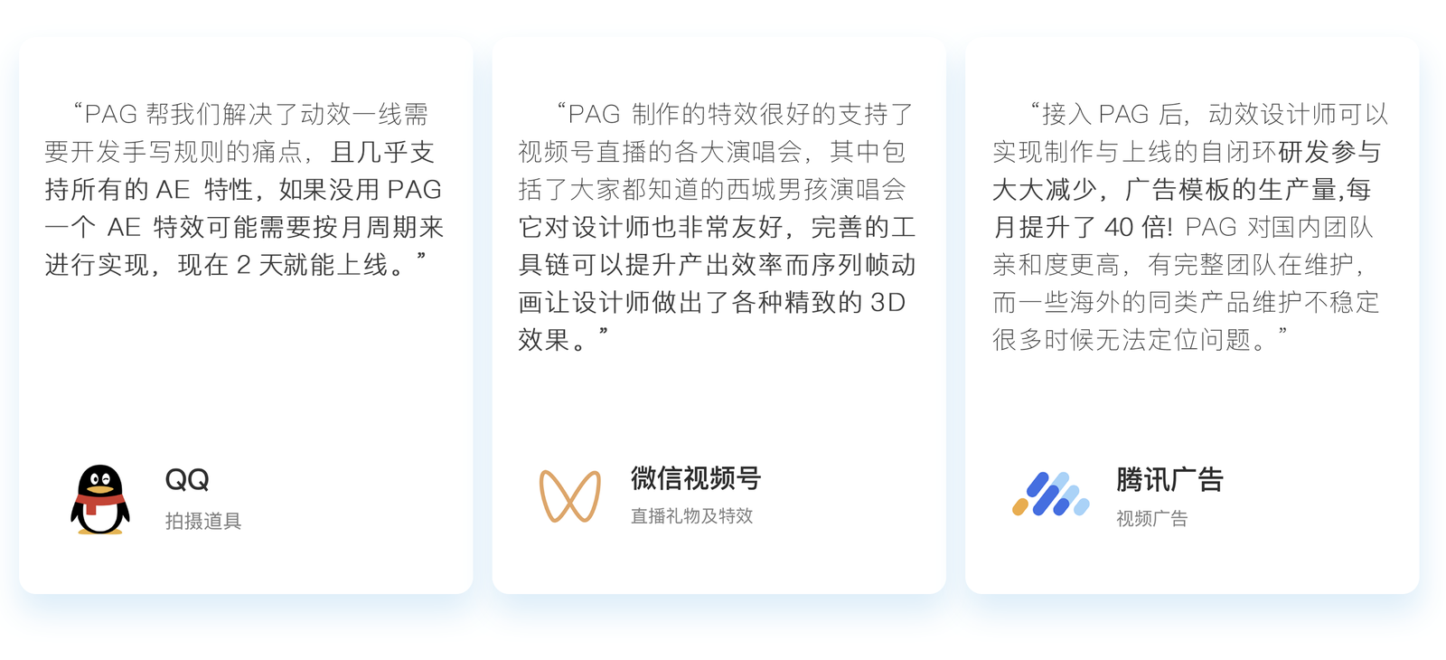 目前PAG已于2022年1月14日正式开源至 Github ,现可免费下载使用。团队日常对接 2000+持续增长的设计师和研发用户群,SDK已接入服务了腾讯内外400+产品业务,包括微信、QQ、王者荣耀、知乎、小红书、哗哩哔哩、虎牙直播、MOMO陌陌、豆瓣等多款产品,稳定性经过了海量用户的持续验证。