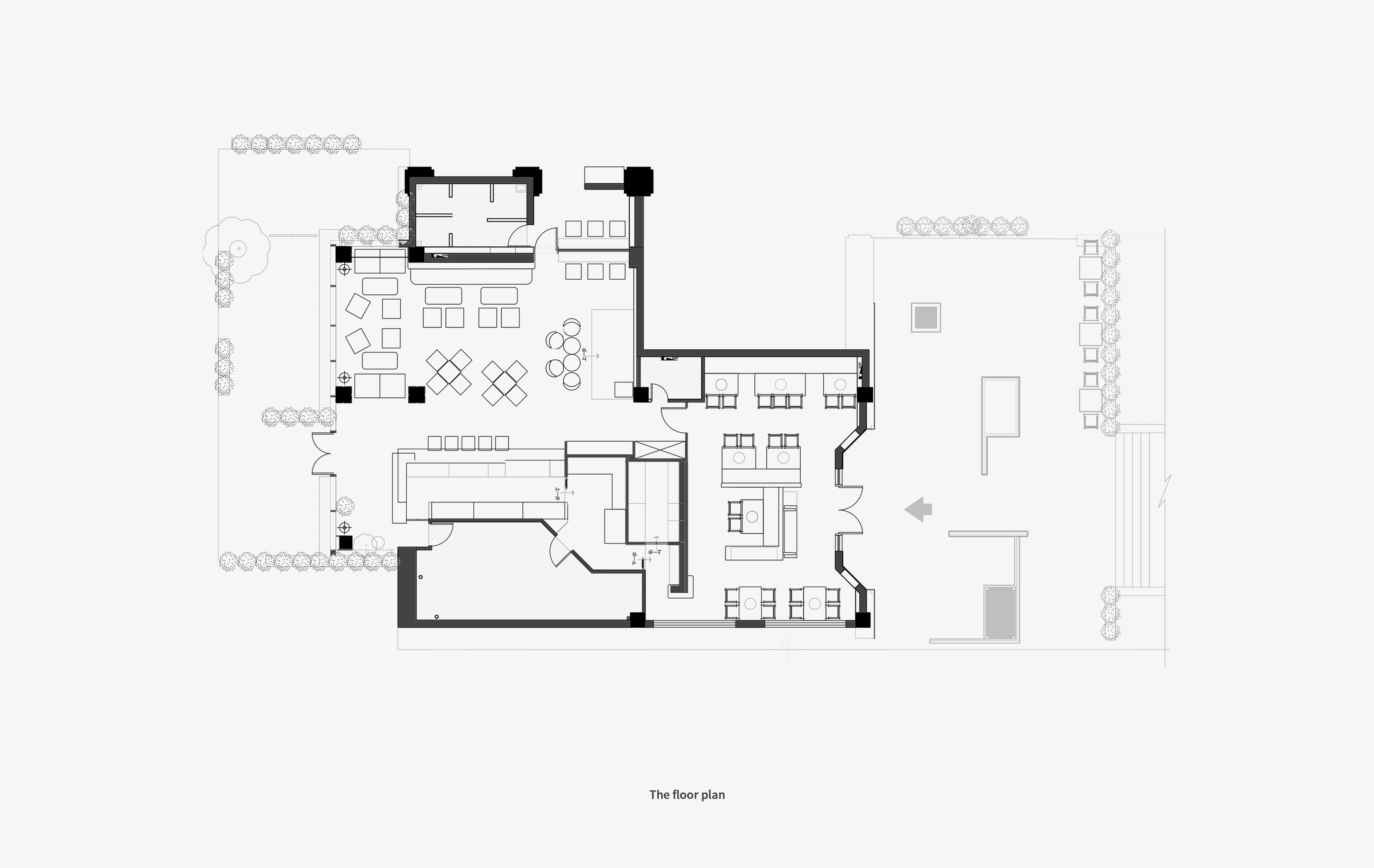 我们通过对店铺实际场地的考察,发现店铺平面就如两个大小不一的矩形,并且前后的两个门分别位于不同的街道,这为顾客进出提供了很好的便利,设计师利用店铺的地理优势,将它划分两个区域作为烤肉和酒吧的运营场所,很好的解决了产品经营过程中独立的问题。