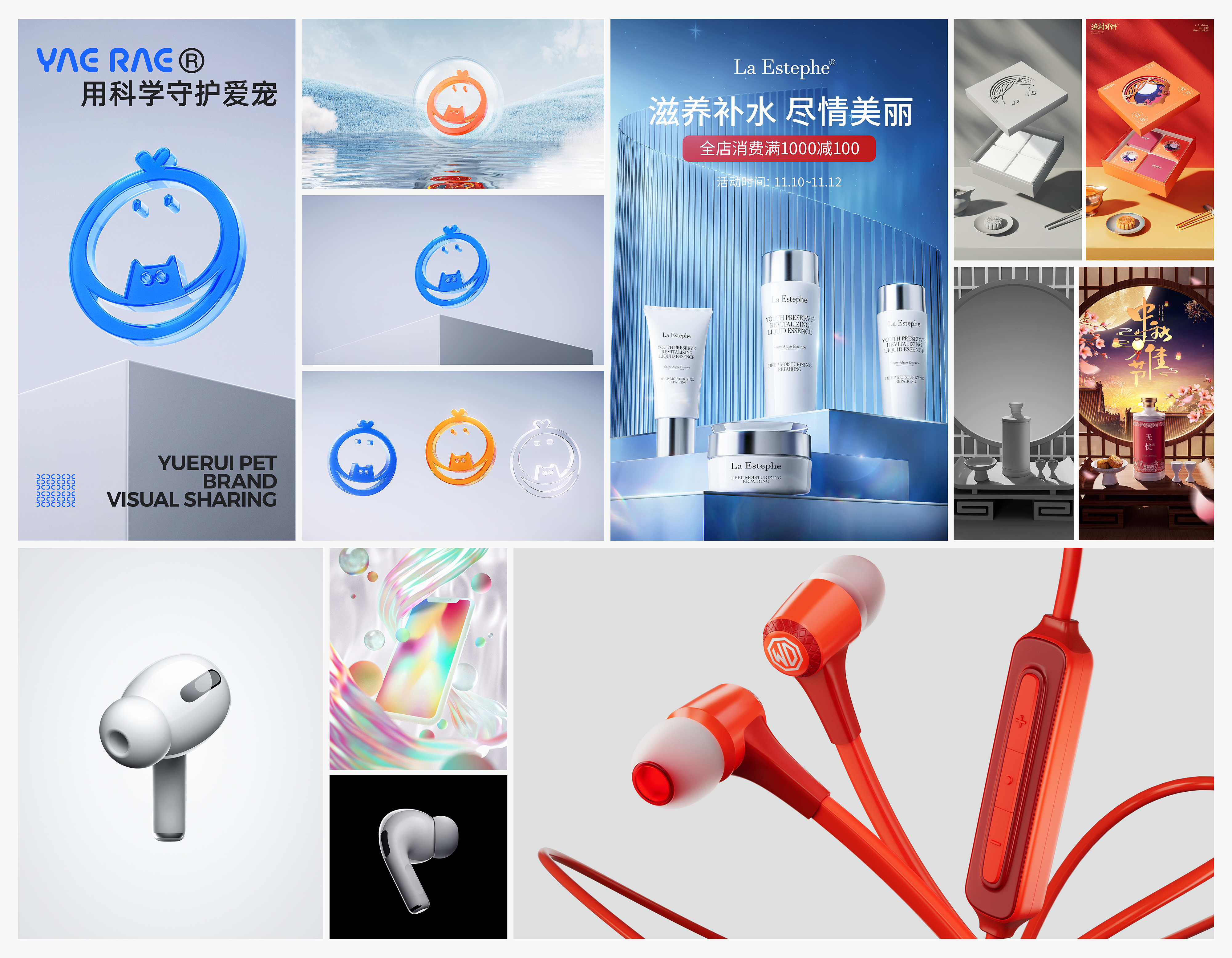 某天我突然发现那个悦睿的案例不好看了,但说不出来问题在哪,于是去跟站酷三火案例做对比的时,我发现了平面图形在头部电商公司里面开始广泛引用,这一套东西使得整个案例看起来非常专业、很整体,所以我慢慢意识到,是否是因为我的作品太注重于效果的表达,而缺少了一些品牌设计的灵魂在里面呢?