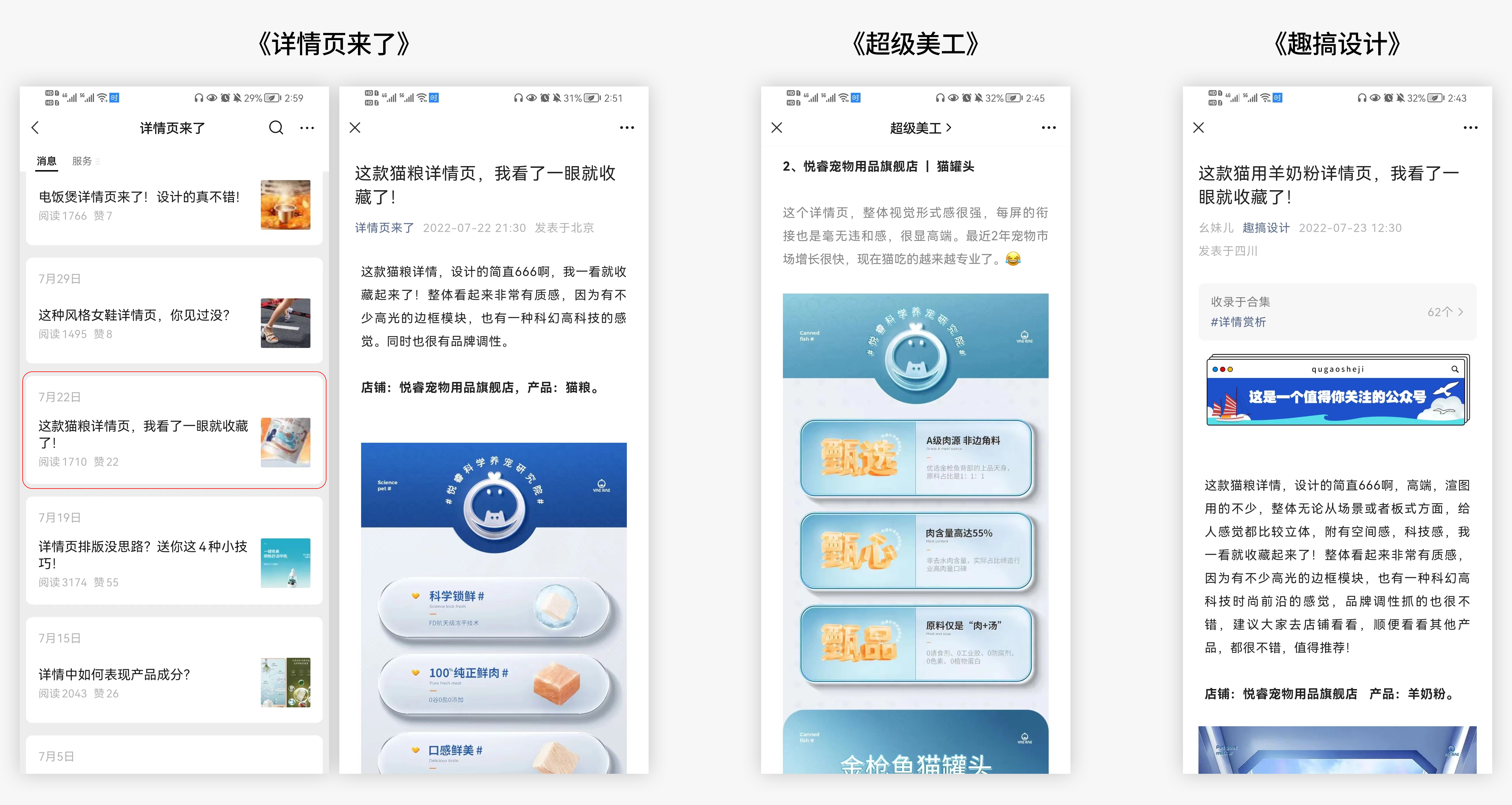 学习素描期间,我与几位好友共同接了一个私单——悦睿宠物用品,我负责其中三个页面视觉的规划与执行,在项目完成以后,得到客户五星好评;发布到站酷,也被广大酷友认可,而且还被多个设计公众号转载,这些成绩的背后有一部分都是归功于素描理论给我的支撑。