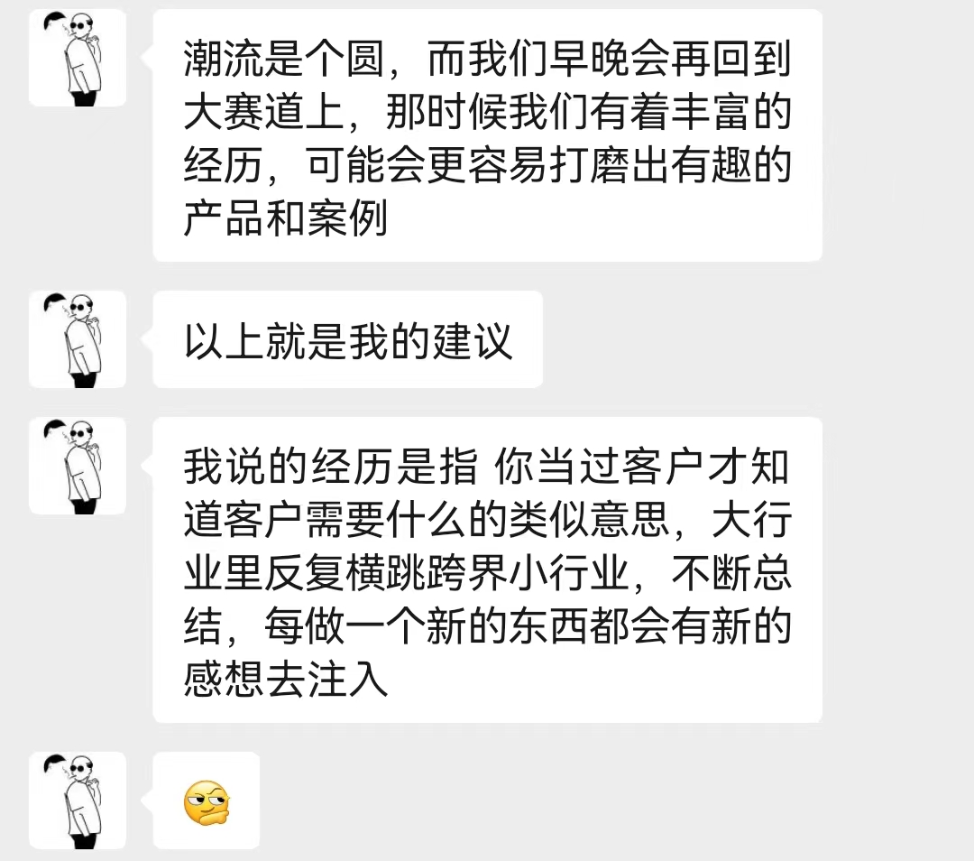 不过好在我跟山海鲸的子画大哥聊了以后,他跟我说了那么一句话:大行业里反复横跨小行业,不断总结,每做一个新的东西都会有新的感想去注入。
