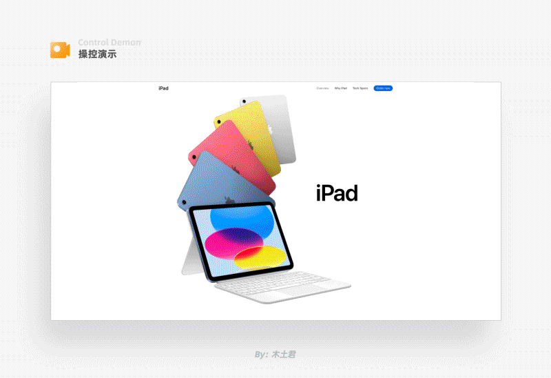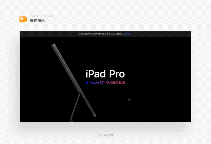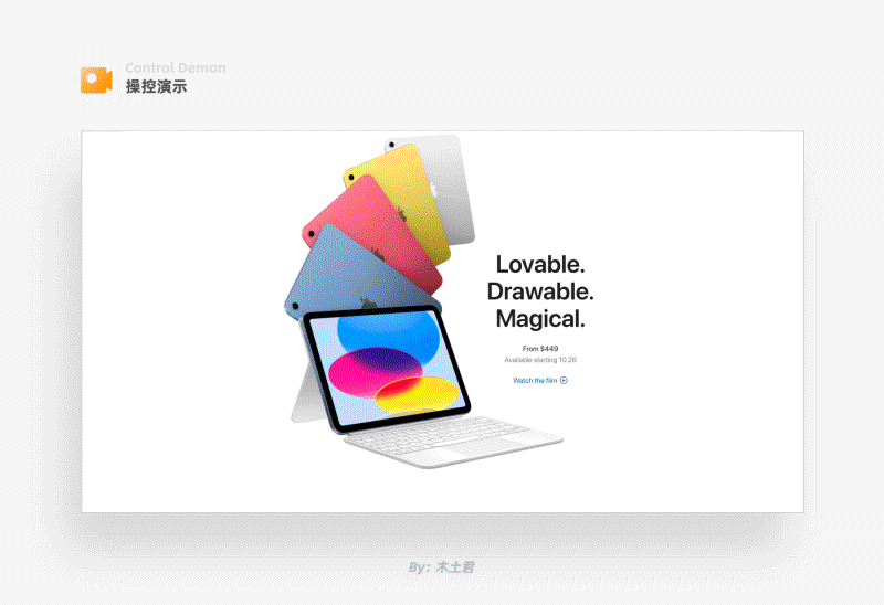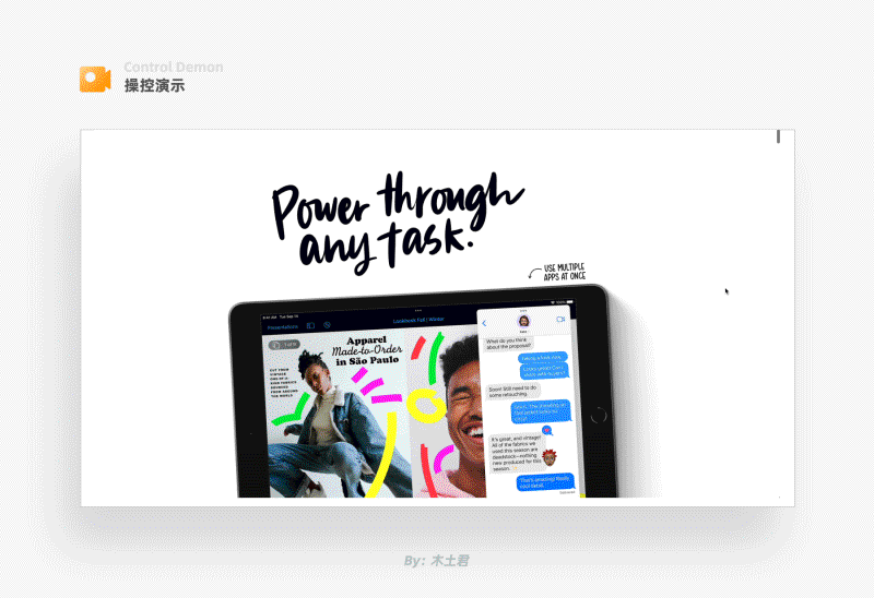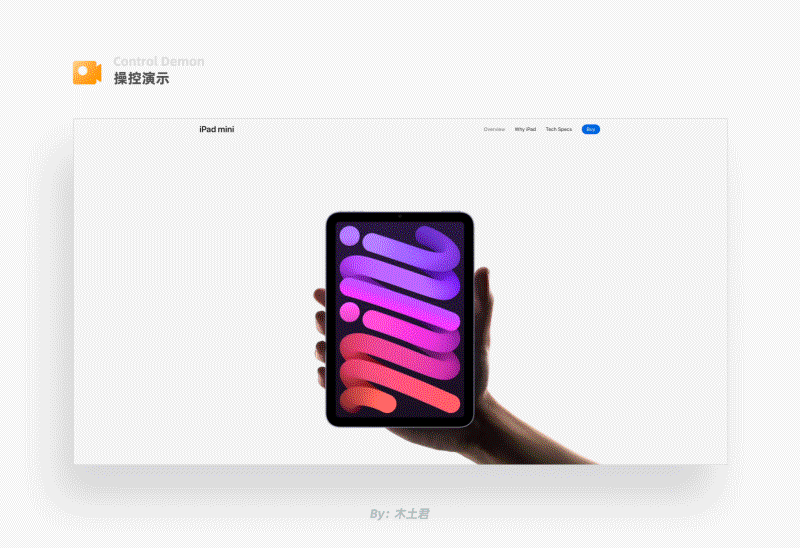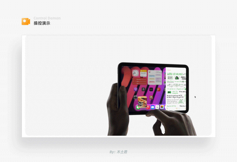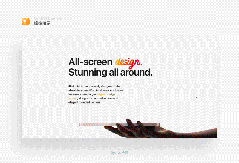 iPad从手上滑落,随着页面往下,ipad被另一只手轻松接住,苹果用这种视觉冲击方式将上下文巧妙衔接,让用户在产品跌落瞬间内心一惊的同时惊呼产品好小好轻。