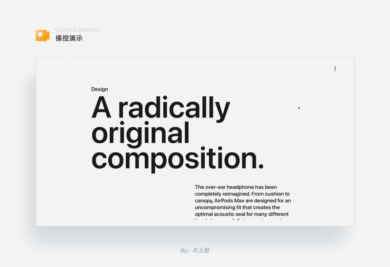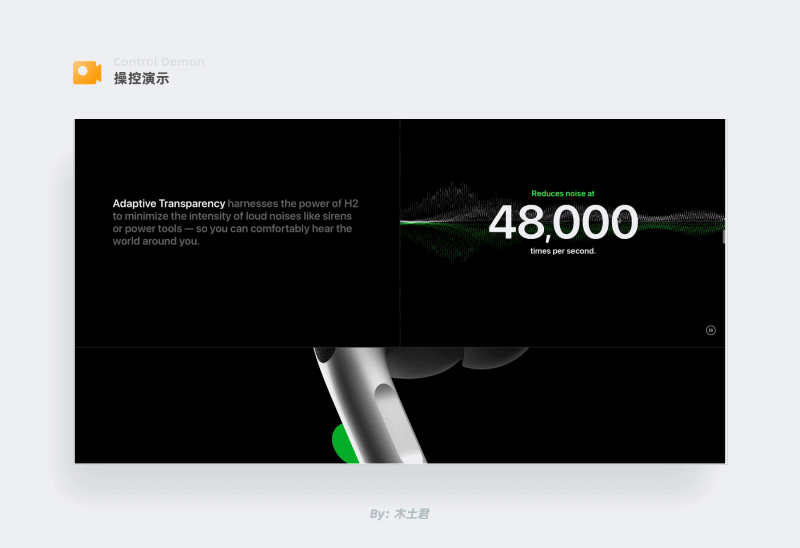 佩戴者逐渐消失,耳机旋转到发生孔的地方逐渐放大,镜头从中间穿过,很自然的出现和音质相关的文案,用户很容易接受并感知到苹果想要让他们了解的卖点。