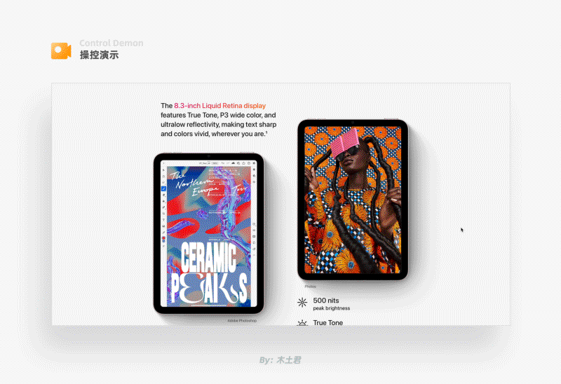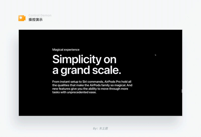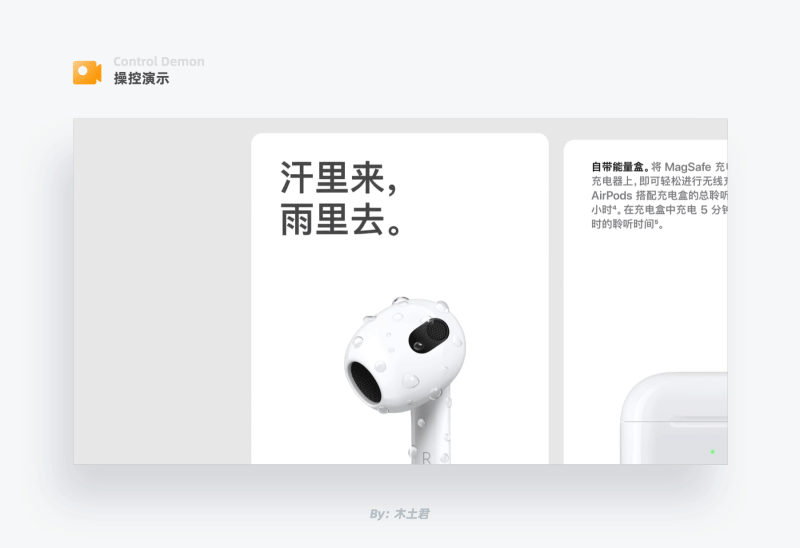 因为是Air系列,核心还是轻盈,我们看看苹果是如何做的。随着页面往下,搭配不同使用场景界面的不同角度产品会以三维立体的方式运动,来配合文案的展示,对于消费者来讲,这种形式就像是在看一场舞蹈表演,会忍不住多看几眼里面的内容。