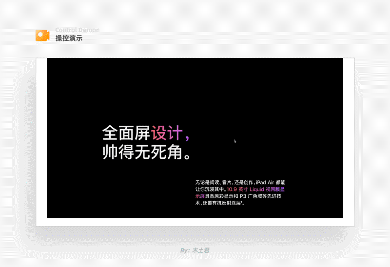 这款Ipad主要以静态内容展示为主,只有功能点使用动态图标,来点缀以及提醒用户注意,之所以这么做是因为这一代相比老款并没有太大更新,只是在原有基础上做了一些升级。