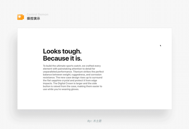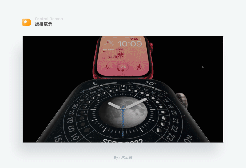 一块屏幕被安装到手表上,随着页面往下滑动,不断切换显示关于屏幕的特性,把消费者的目光聚焦在产品及卖点上,最后产品稍微倾斜展示一部分屏幕内容打破之前的布局。