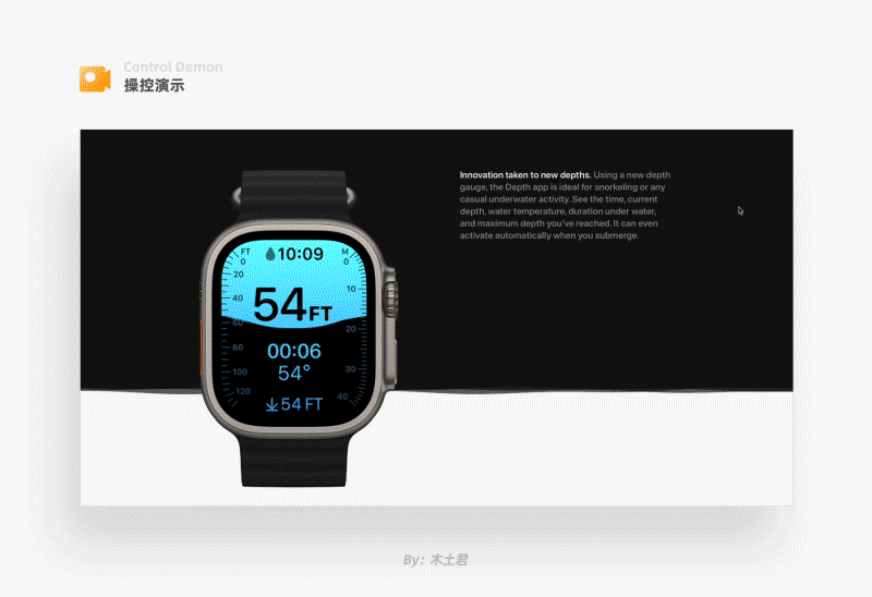 这款手表在防水性上达到了新的高度,为了让消费者感知到,苹果利用网页上下滑动的高度差,为消费者做了一个可以交互的效果,消费者浏览网站的同时就已经仿佛在潜水使用它了,会增强购买欲望。
