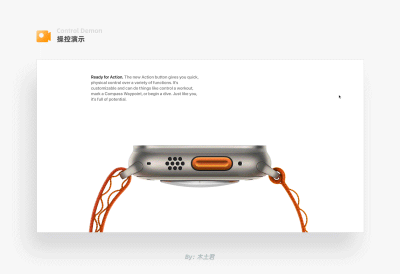 使用产品操控场景的动画,让用户身临其境,仿佛自己在使用,通过旋转的方式来切换不同的使用场景,这种巧妙的方式可以减少内容切换的割裂感。