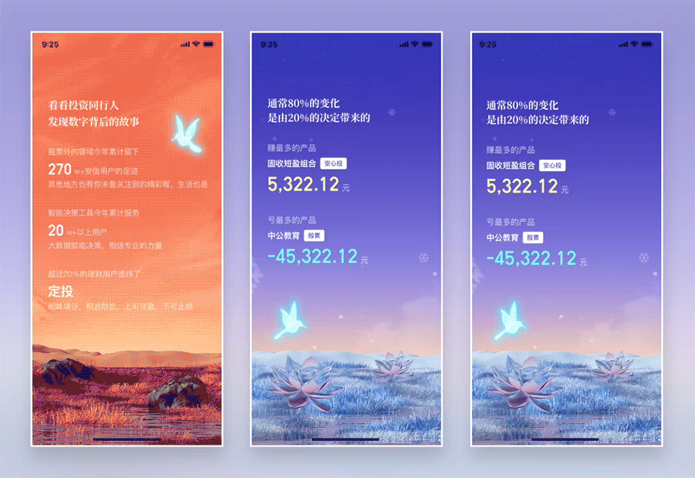 今年年账单在方案设计、视觉、数据上围绕关键词“温暖+陪伴”展开。关键词的确定,我们把整个环境气氛都渲染在温暖的色调下,开篇安信吉祥物“安心牛”拉近与客户的心理距离,引领客户回顾一年的投资之旅。这也是安信的吉祥物刚出生就被公司拉出来打工的首个项目…
