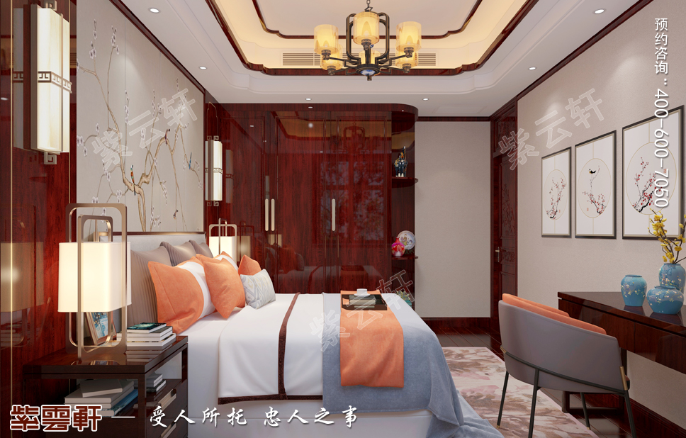 女儿房,活泼明艳的色彩搭配主要表现在床品与背景花鸟图的结合,表露出女孩子端庄秀气的温婉气质。组合书桌丰富了学习休闲之便,让整个卧室的实用性更强。中式房间效果图更多的是展现一种飘逸与洒脱,每个细节之处的装饰都在简约中蕴含大气,更给人一种返璞归真的感觉。