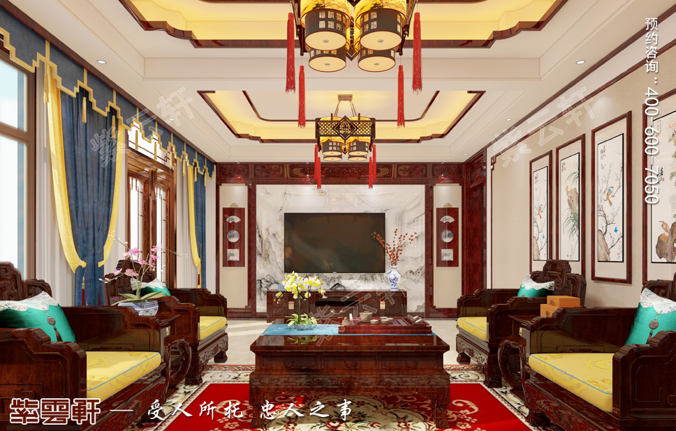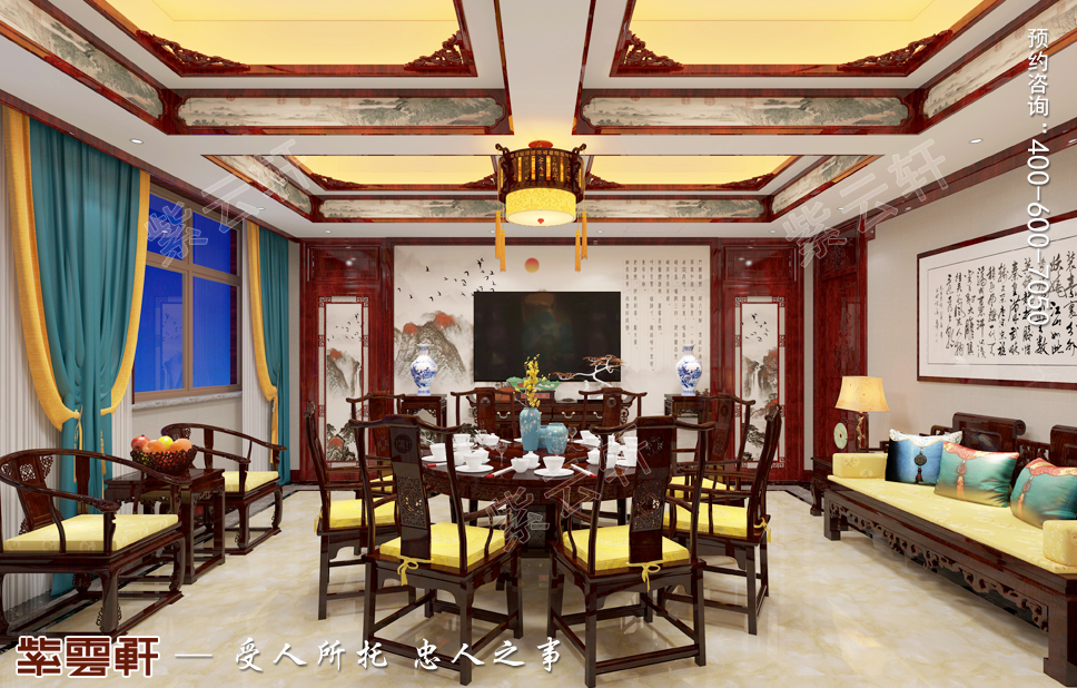 客厅,在红木家具与明黄色靠枕的呼应下,让整个客厅有一种富丽堂皇之感。一幅绮丽恢弘的千里江山图将会客区域的艺术氛围发挥到极致,客厅空间以红木与浅色背景基调为主,在中式设计的渲染下,演绎古典家居的奢华与典雅。
