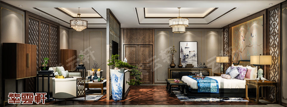 卧室,在卧室连接处,通过一扇中式屏风隔断处理空间架构,设计出另外一处日常休息空间,小沙发与茶几组合精致耐看,给生活增添了些许滋味。墙面的装饰画和木饰面带来一丝艺术气息,雅致的卧室在繁华喧闹的城市中也能让身心得到彻底放松。整套中式住宅效果图将一步一景的家居展现的淋漓尽致,这样的家居住着才舒服。