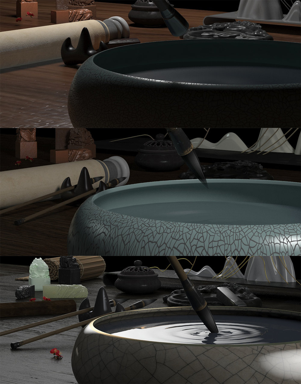 瑞云渲染:你们如何制作出这些令人惊艳的研墨、沾墨和绘制等水墨画相关的效果?