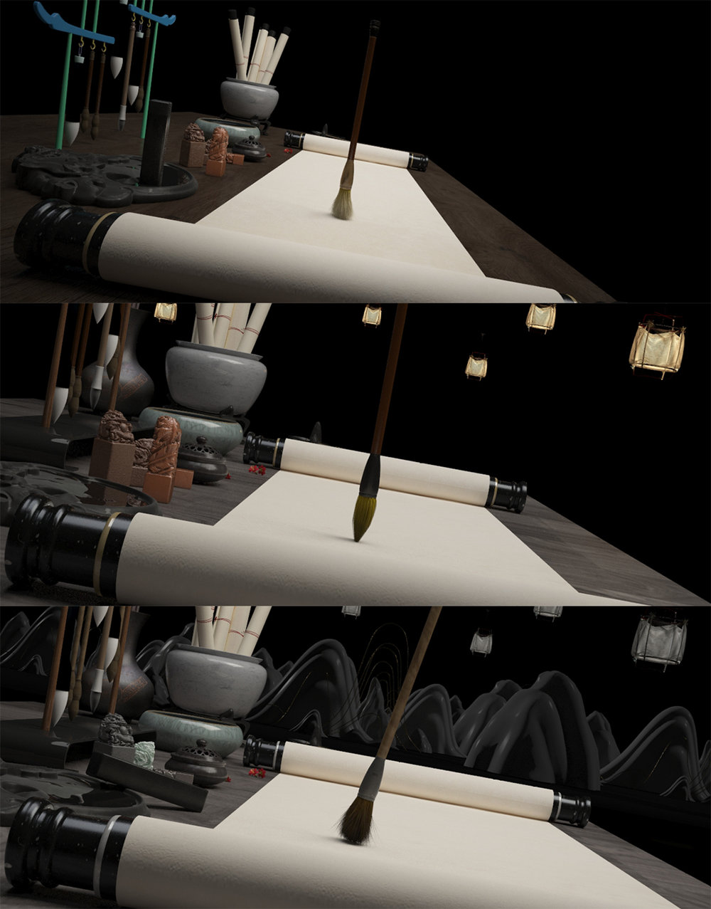 雷成:研墨的过程是使用了phoenixFD ,测试了很多次,最后终于是得到了一个相对满意的效果。绘制的过程是后期使用AE制作的,相当于是一笔一笔地画出来了,比较麻烦。