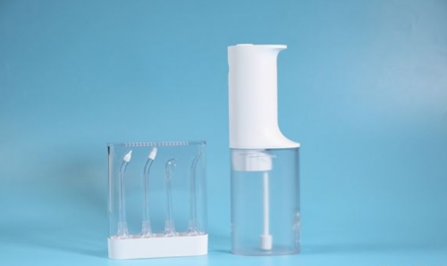 这款冲牙器的水箱是透明的,透明的水箱设计可以方便我们观察水箱内部的洁净程度,以及使用过程中掌控剩余水量。它的水箱是塑料材质的,表面附有FET保护膜,这样能防止刮花,还能让水箱看起来更有质感。